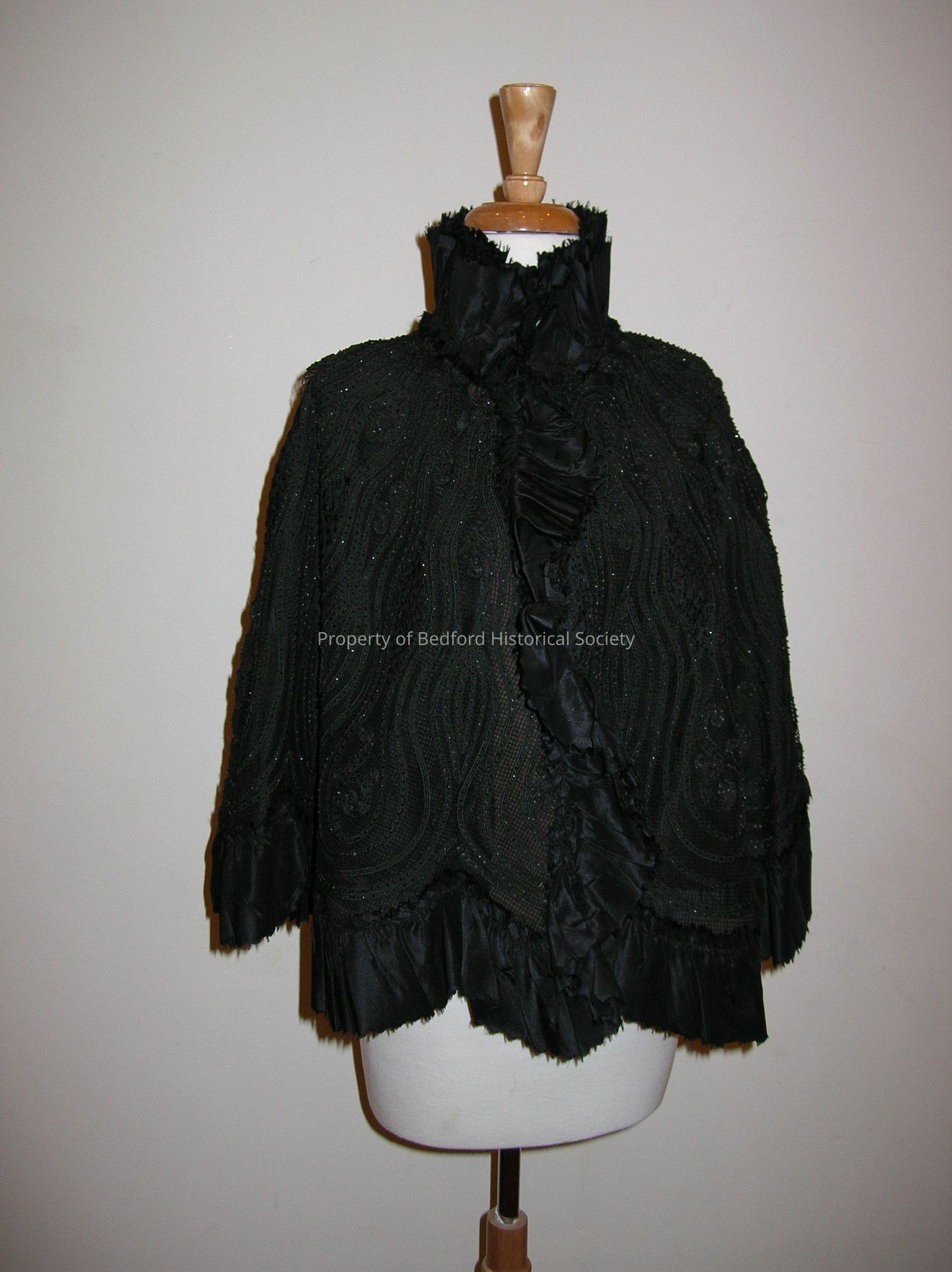 Black taffeta cape with cording and beading (jet?) over mesh. Ruffled taffeta at hem and neck. Nineteenth century.