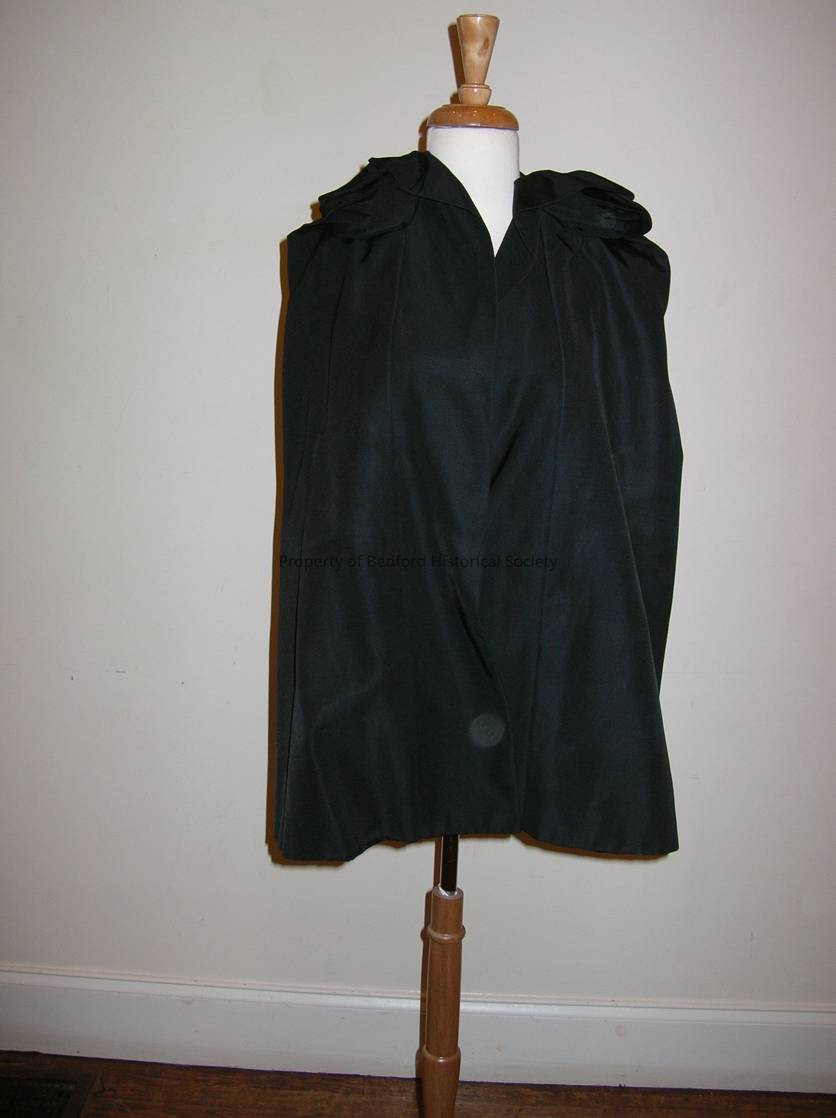 Black silk faille collarless cape with navy taffeta lining. self rosettes at front shoulders.
