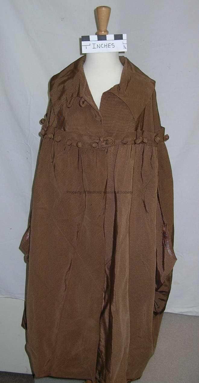 Cocoon cape, 1910s, taupe ottoman, flat collar, trimmed around the yoke with a wide self band with large self ball buttons, lined with silk printed with a Chinese dragon design in shades of pink, lavender, mint green and black against taupe, excellent condition.