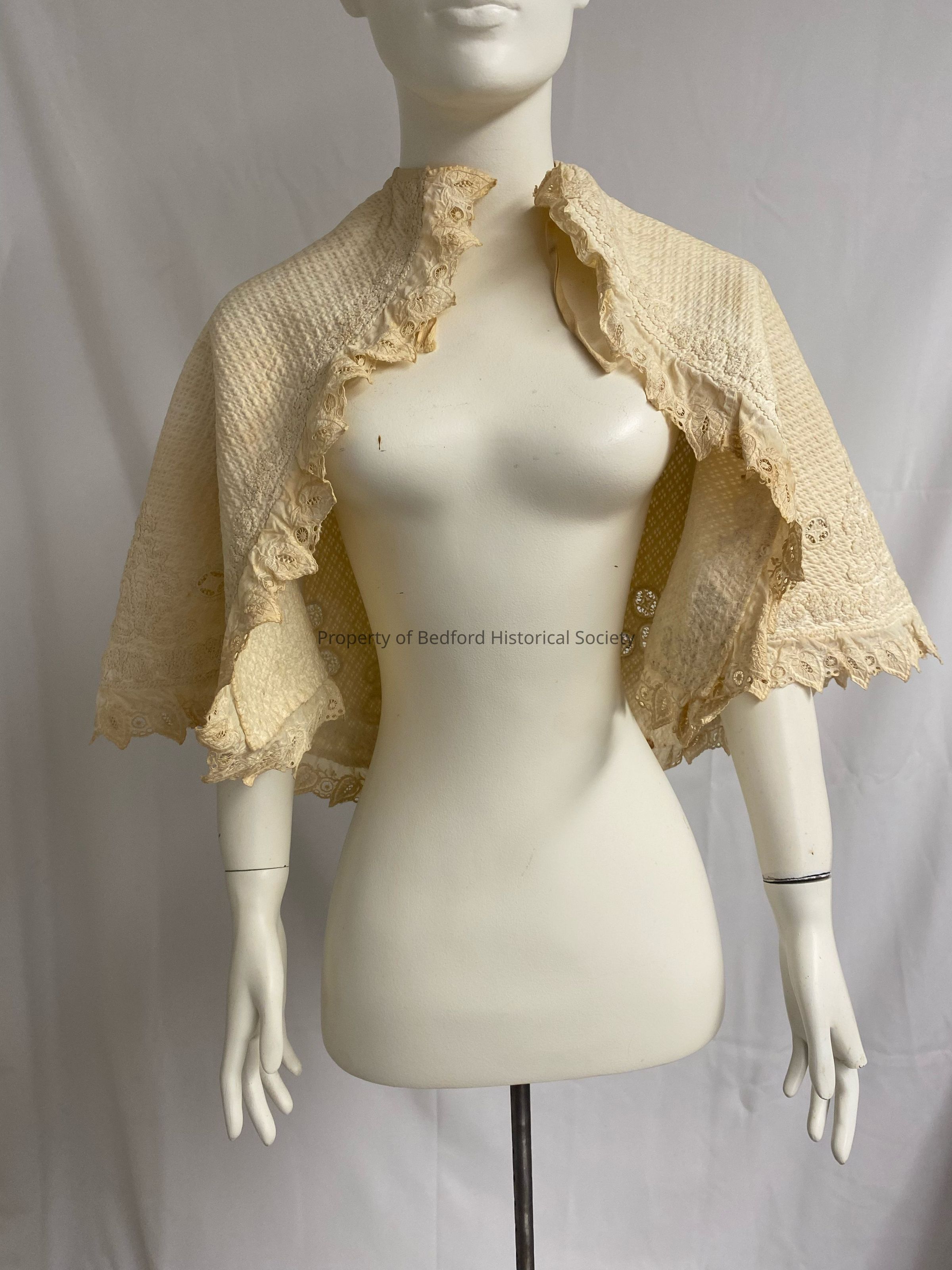 adult cape in quilted? material with scalloped broderie anglaise edges. FIC.2023.25.10 is child's version