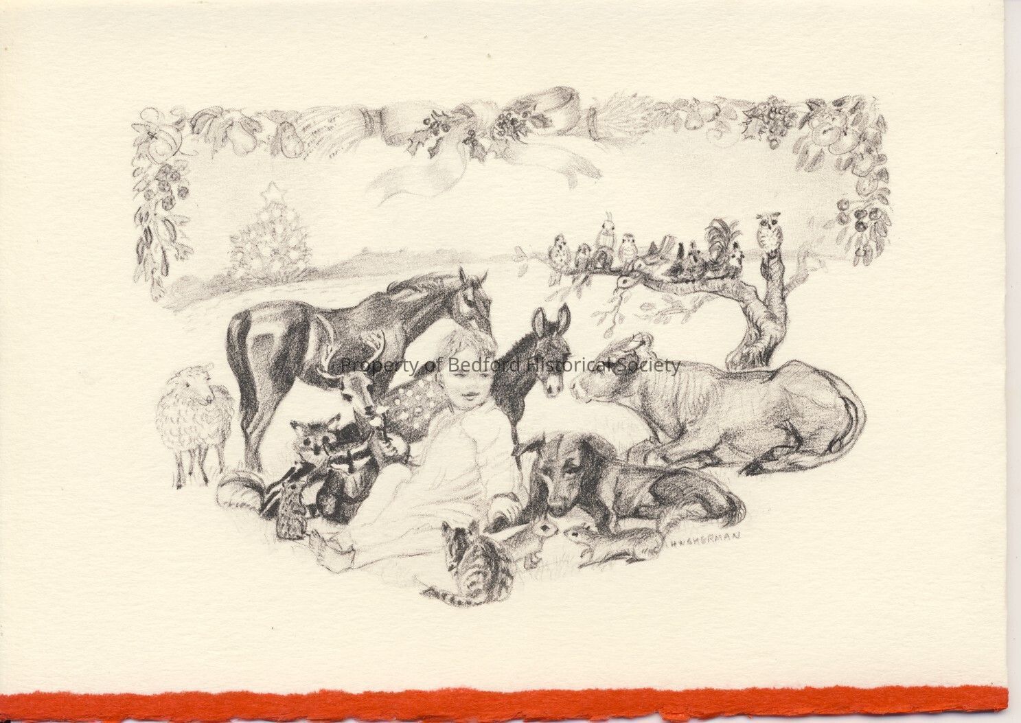 Christmas Greeting cards personalized by Mr. and Mrs. Thomas Mercer Waller. 5 Different designs, some duplicates, 8 in total. Black and white drawing of horses, animals and infants.