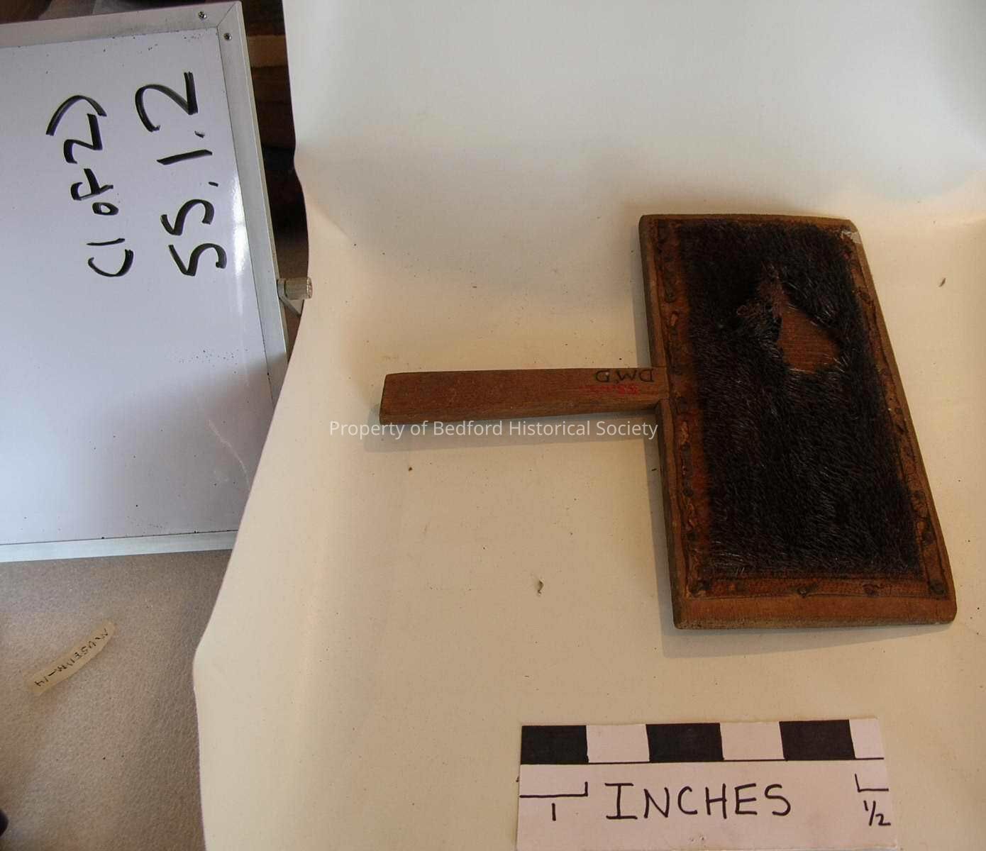 Pair of carding brushes used for carding wool. Initials carved into handles: "D.M.D." *used in carding wool in preparation for spinning into woolen yarn.