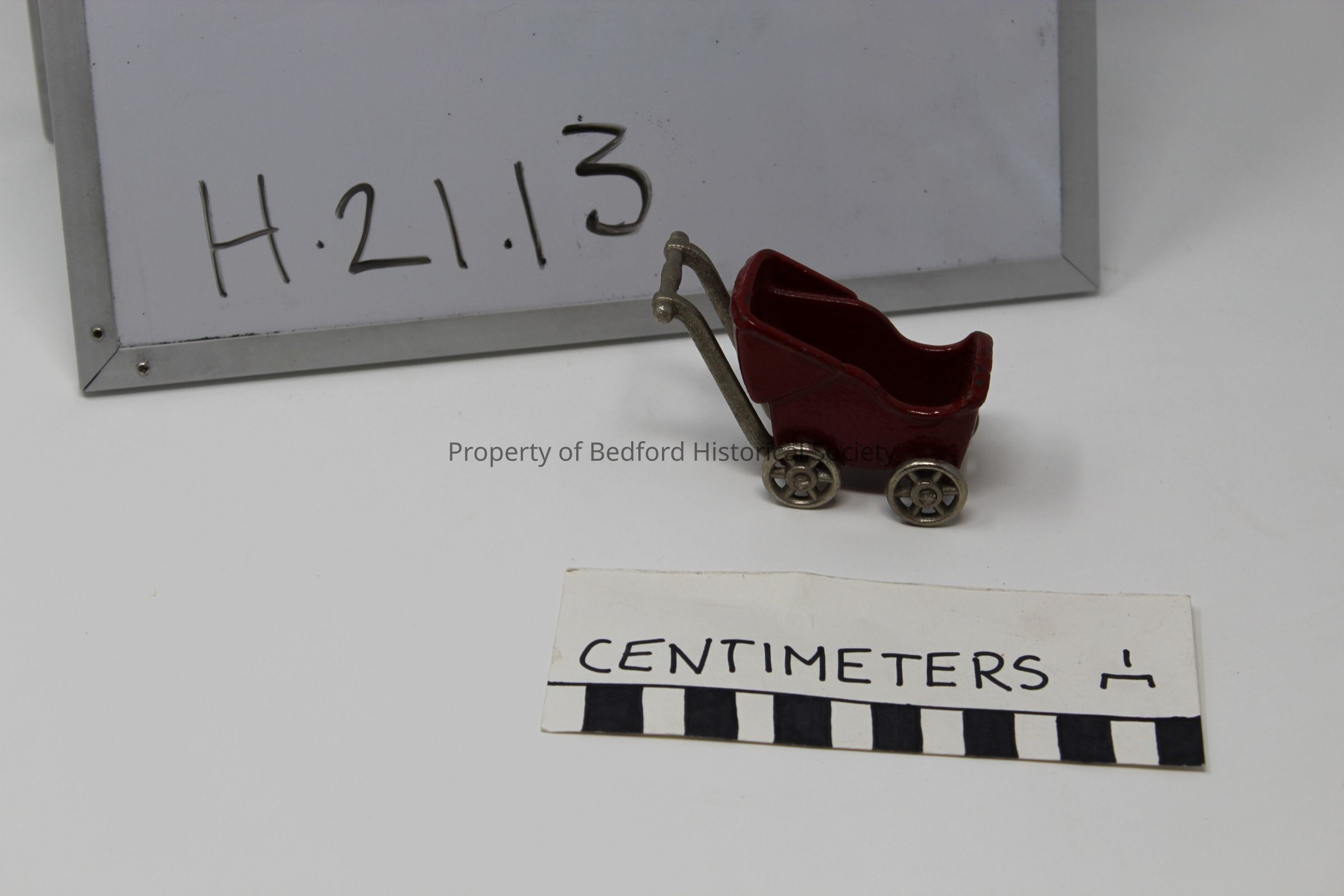 small tin toy carriage painted red with silver handle and wheels 3" L, 2" H