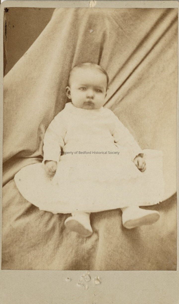 Photo of baby in white dress. Back reads " Sadie B. Gardner/ 3 months/1882." part of Gardner/Sarles Collection