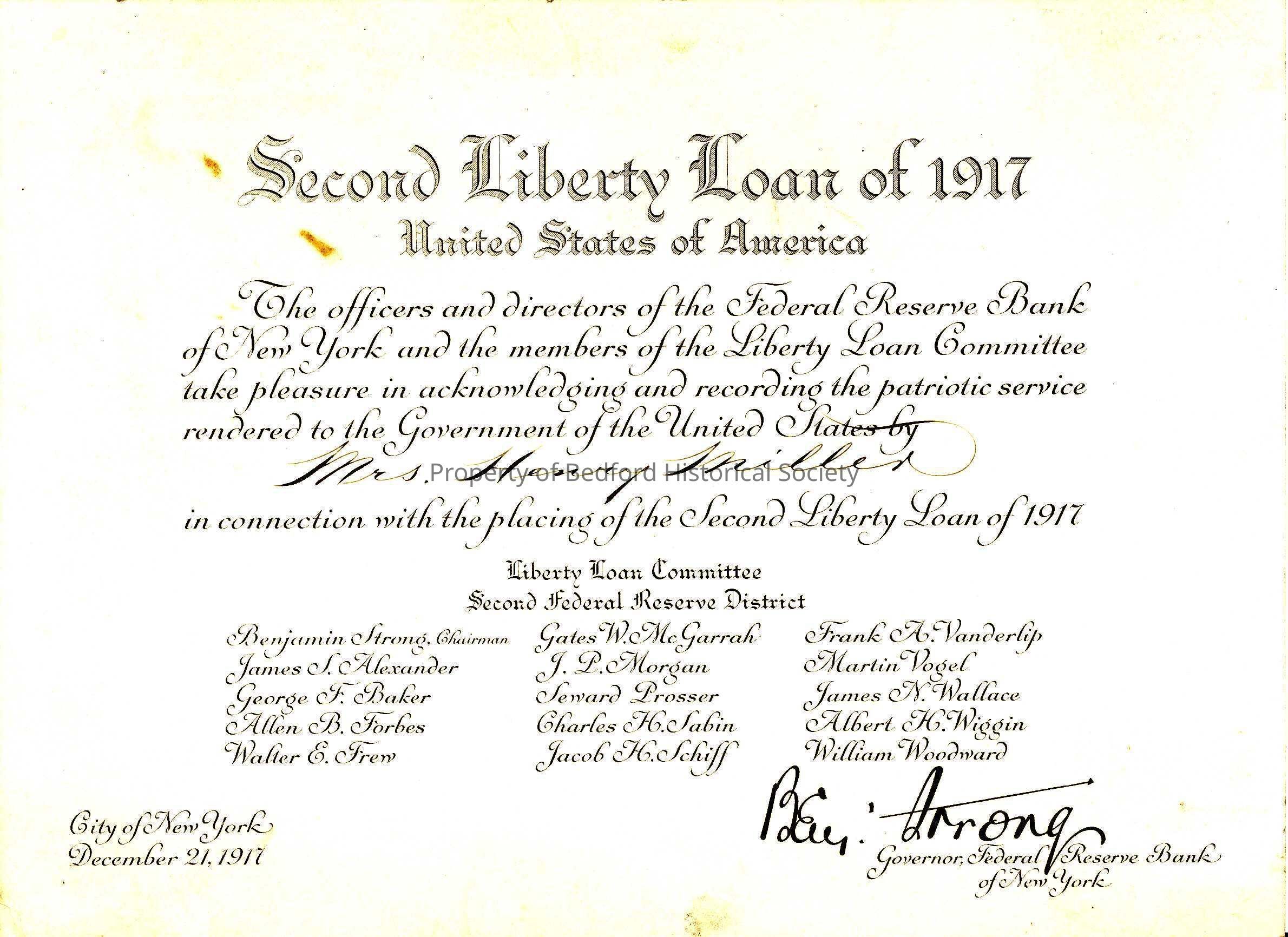 Certificate for Mrs. Henry Miller from the Federal Reserve Bank of New York and members of the Liberty Loan Committee, 1917