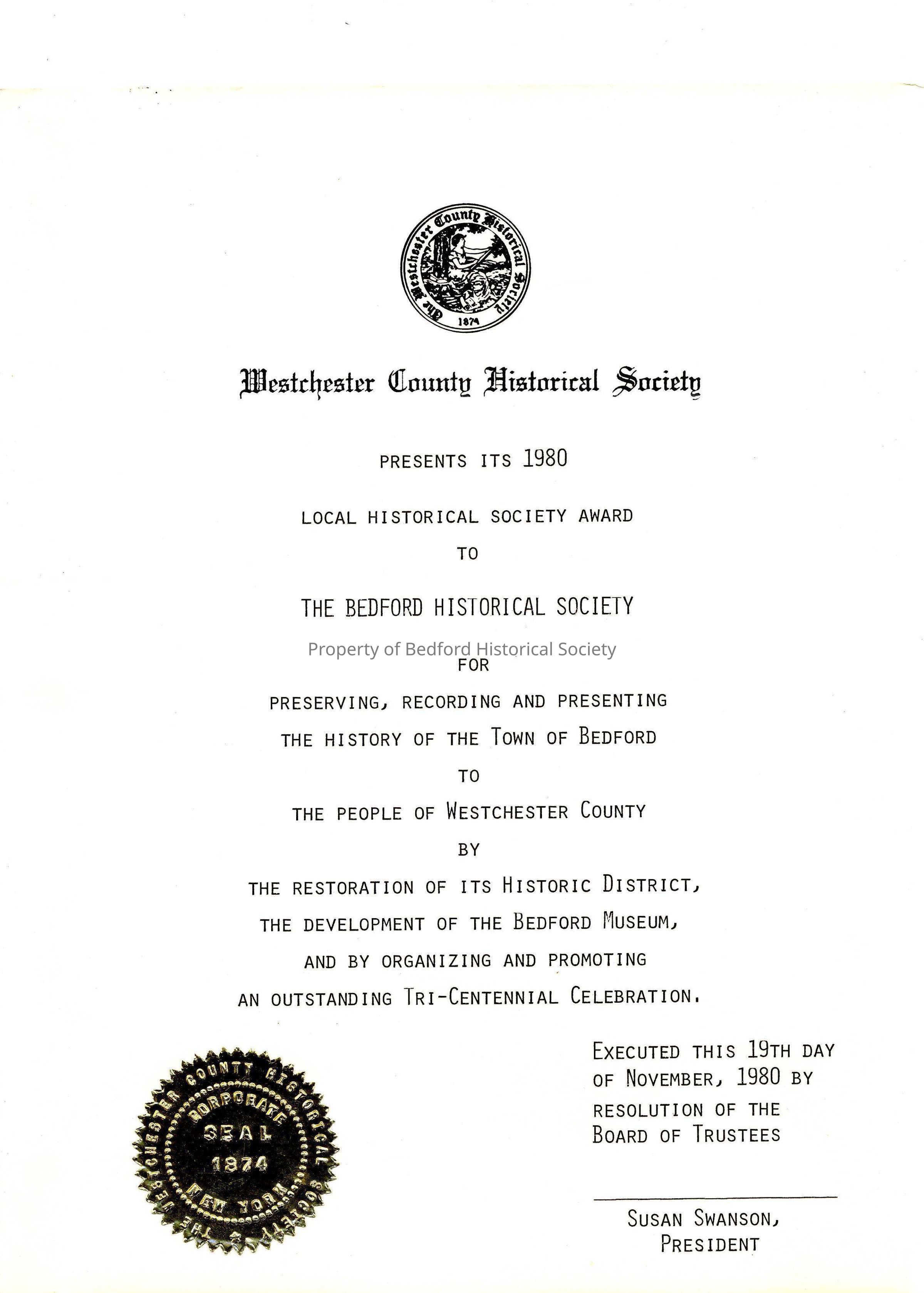 Certificate for the BHS from the Westchester County Historical Society, 1980Entry/Object ID