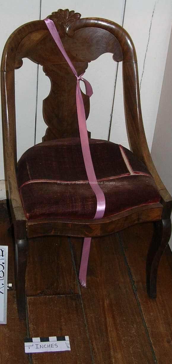 Mahogany chair (part of pair), saber leg, slip seat, American Empire, side chair. Red velvet fabric, "spray" carved crest rail, serpentine fronts, used in pulpit by the old Presbyterian Church, c. 1840-1845