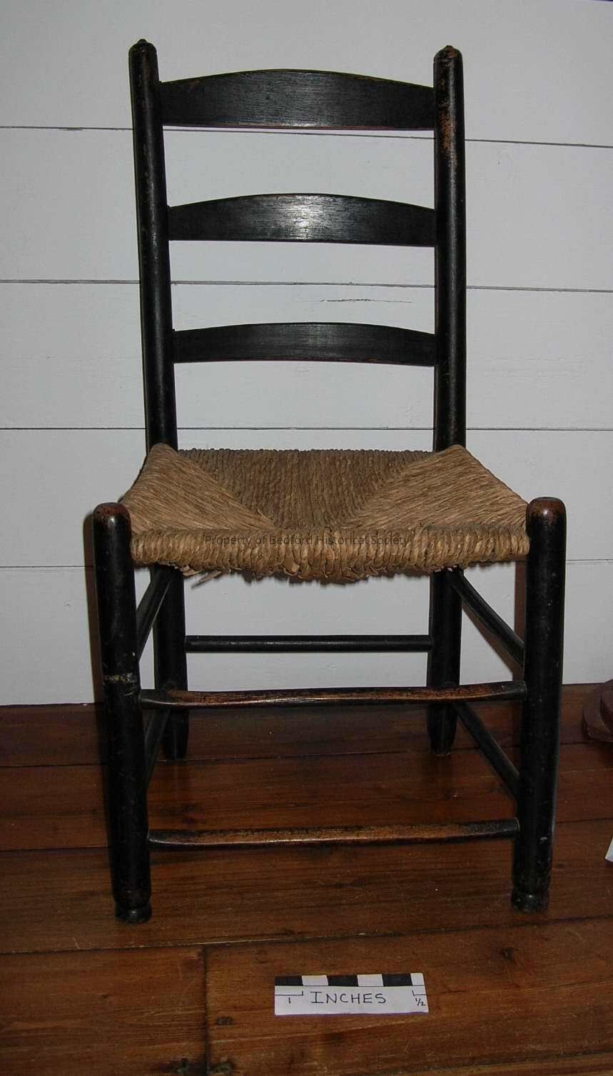 Card: Chair, three slats, black paint, rush seat; seat front 17 3/8", front to back 14 3/4", floor to seat 15 3/4", floor to top 34 1/4"
