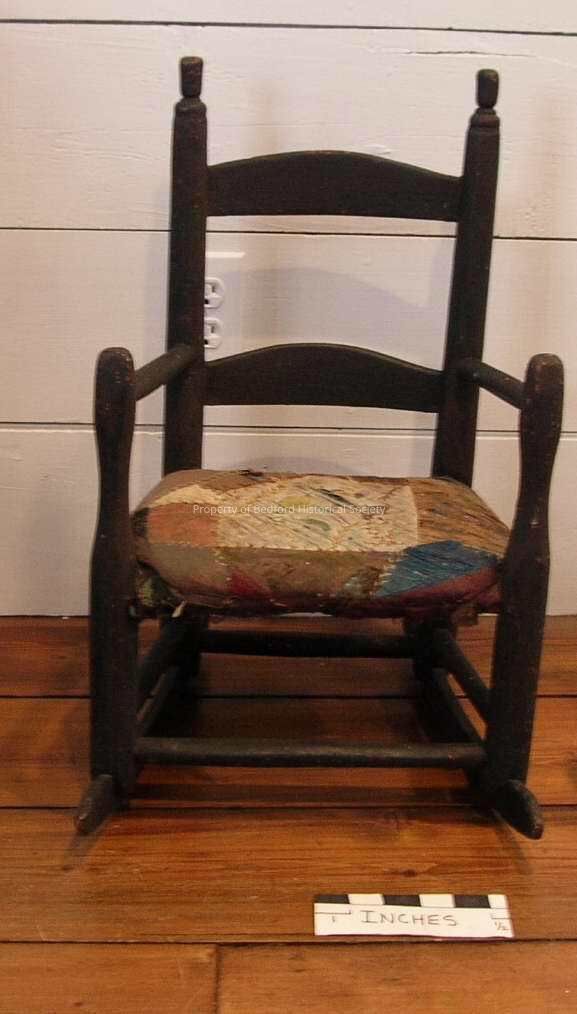 Child's rocking chair, painted black with crazy quilt seat. Note: this is infested, and has been bagged until further action can be taken. (EZ 2008)