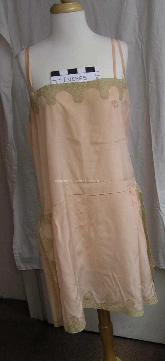 Lace-trimmed chemise, possibly part of a trousseau, circa 1925, monogram LHC (Lillian Hoyt) peach pink silk crepe de chine inset with beige lace in an interesting variation of scallops, good condition