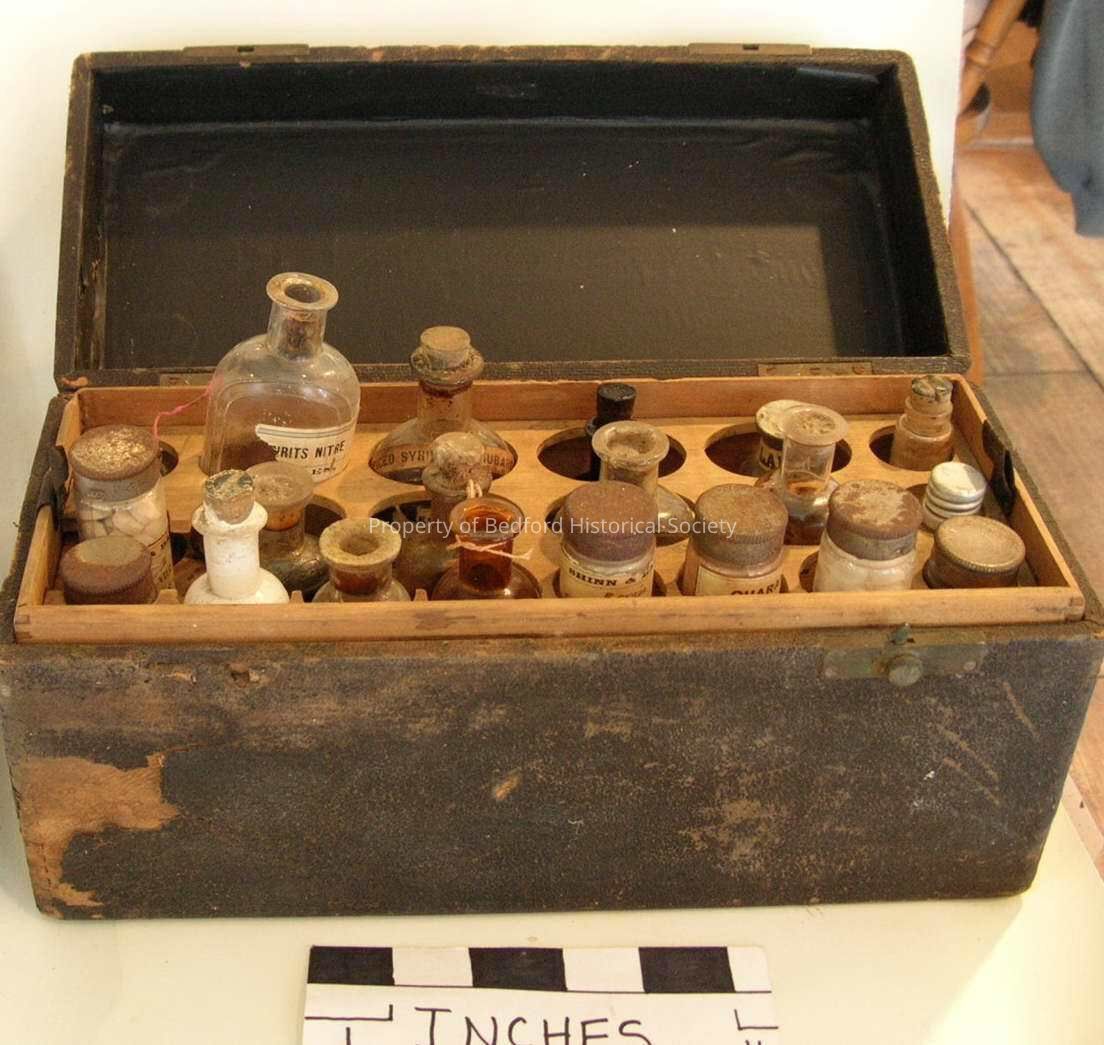 Medicine chest, black leather, marked "W." (One end of handle off and one catch off). Property of Mr. James Wood, c. 1870