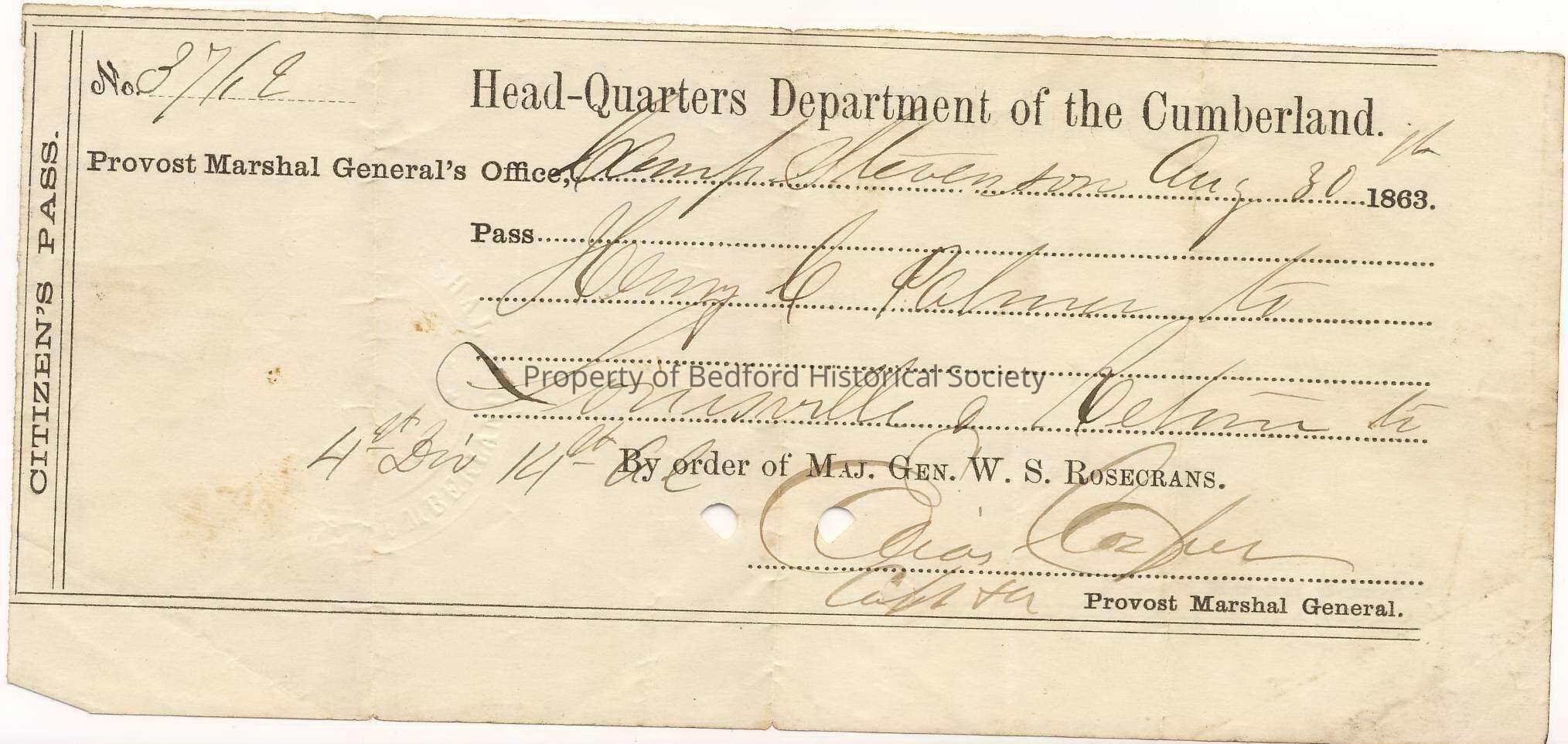 Citizen's Pass for Henry Palmer, August 30, 1863