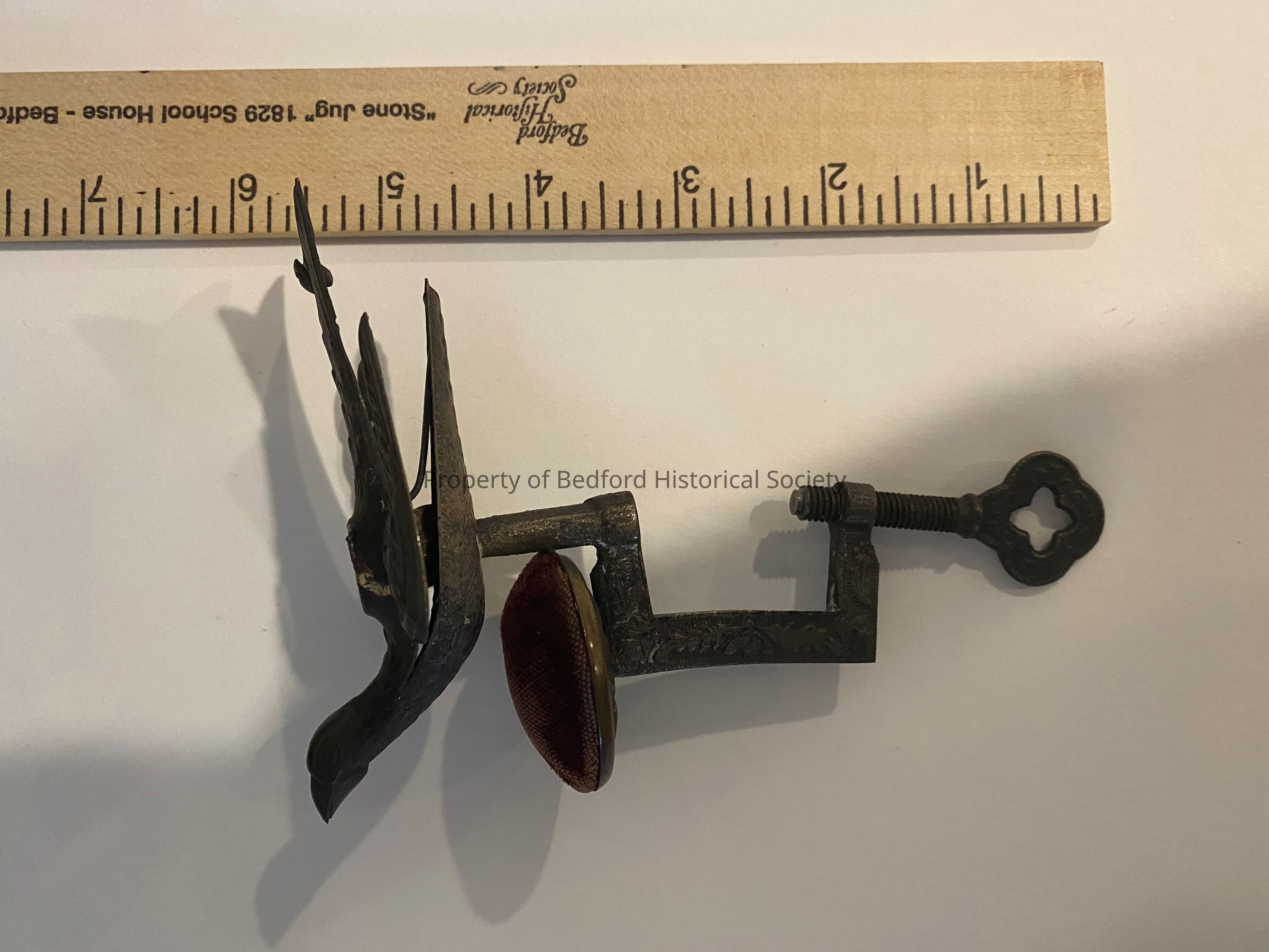 "Hemming bird" iron clamp with pin cushion and candle holder