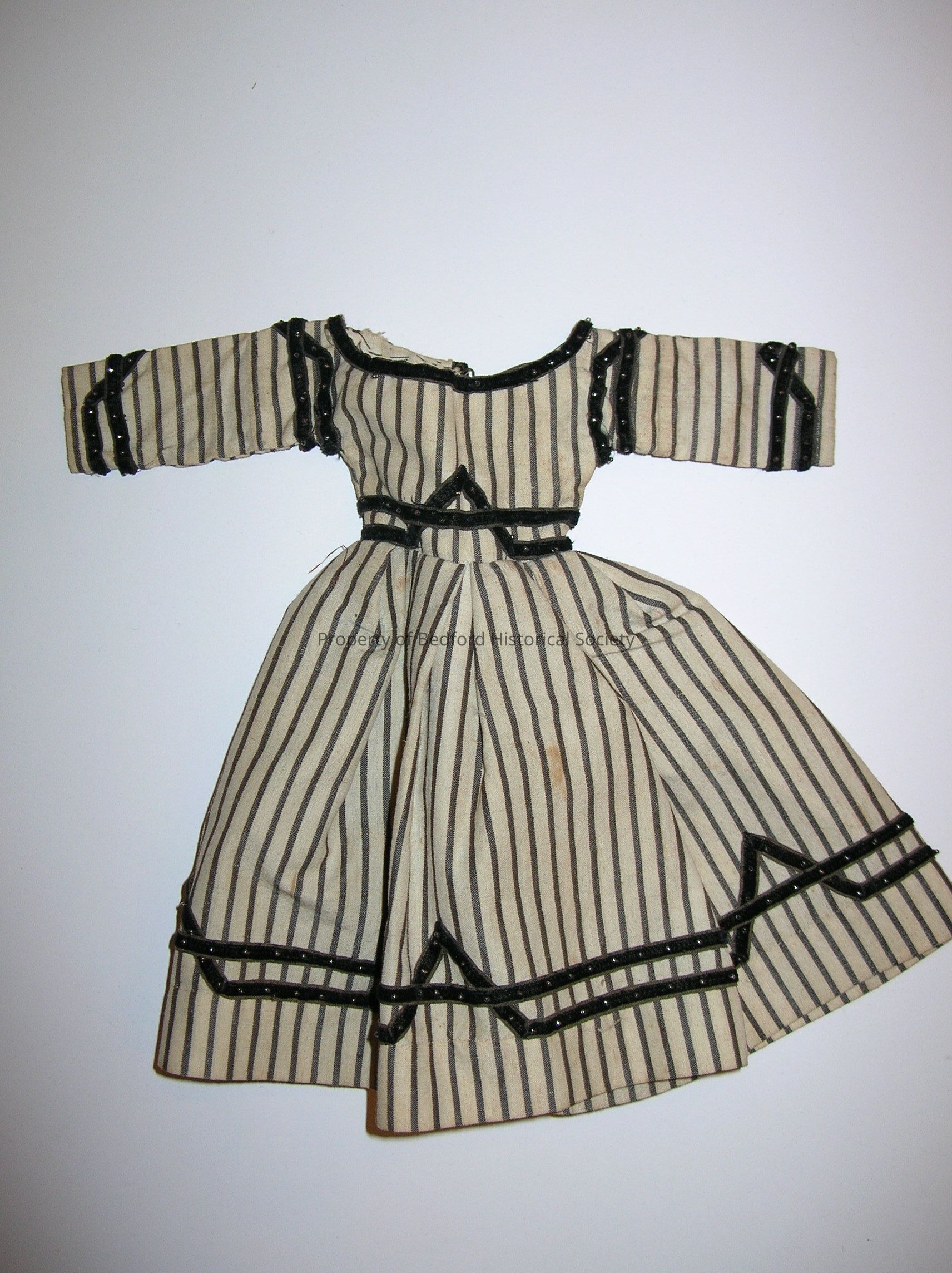 *catalogue card found in 2021 reads: black and white stripe dress w/ velvet and metal bead trim, date acquired: May 1970, Source: Mrs. Wm. B. Chappell, Somers, N.Y. formerly Mt. Kisco