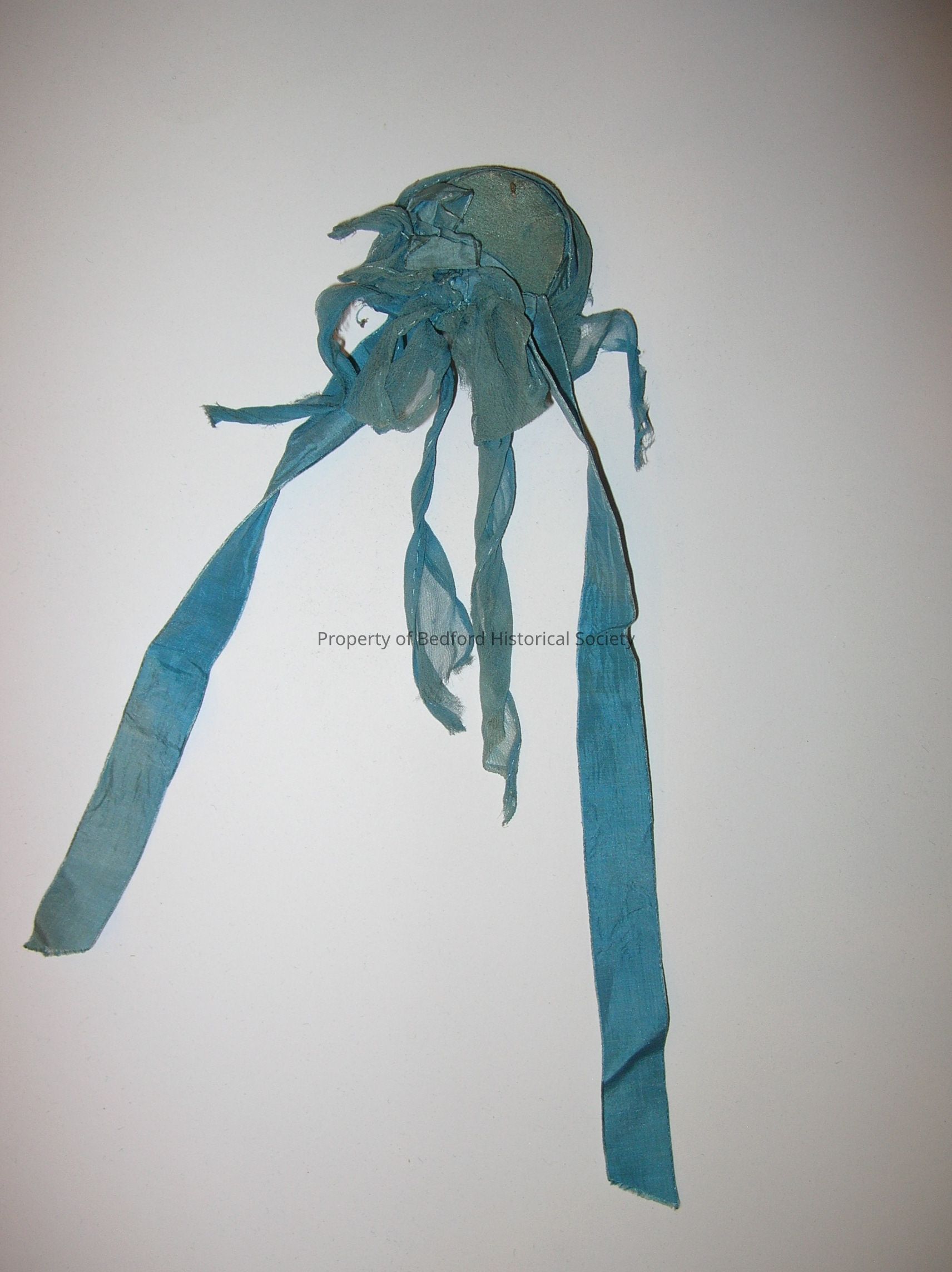 *found catalogue card in 2021: 70.39.24, blue crepe bonnet with blue ribbon, acquired May 1970, Source: Mrs. Wm. B. Chappell, Somers, N.Y. formerly Mt. Kisco