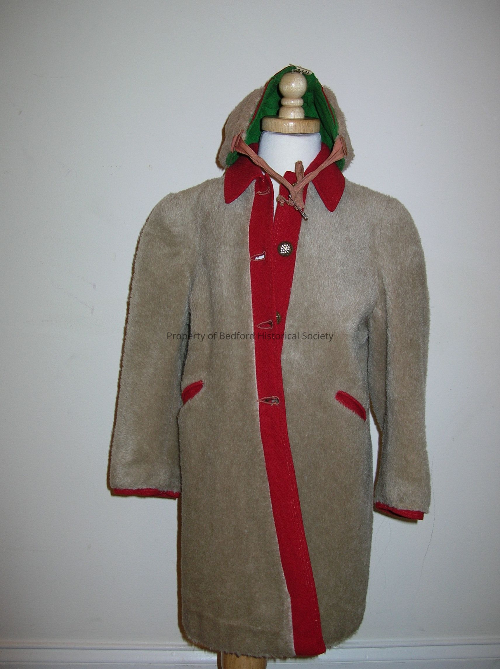 Three piece children's outfit: tan pile coat, red wool pants, and hat. Label (indicating owner?) in coat reads "Diana Smidt.'"