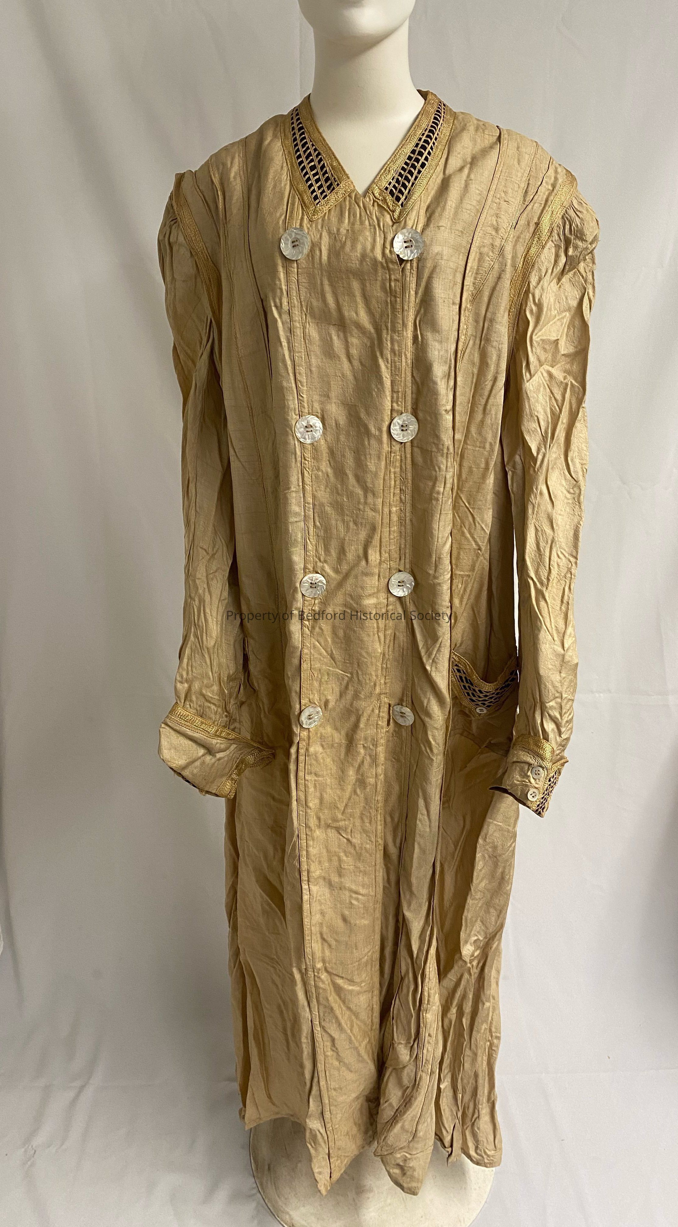 Tan double breasted silk pongee duster coat with large mother of pearl buttons