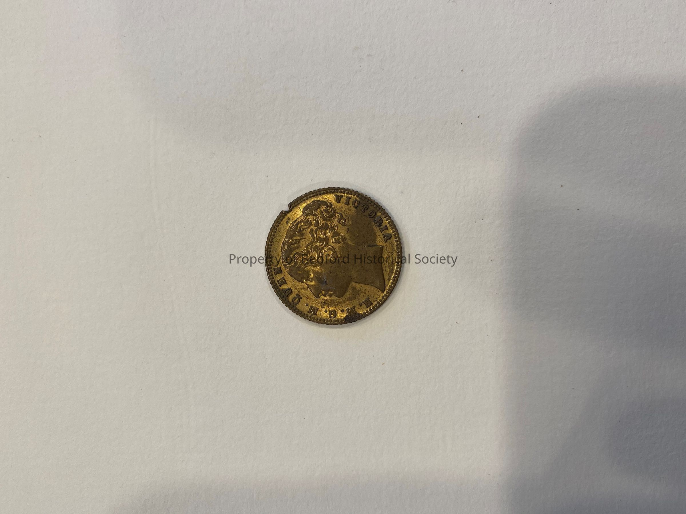 Gold/brass coin, "To Hanover 1830", Officer on horse, reverse side features image of young Queen Victoria "H.M.G.M QWEN/VICTORIA."