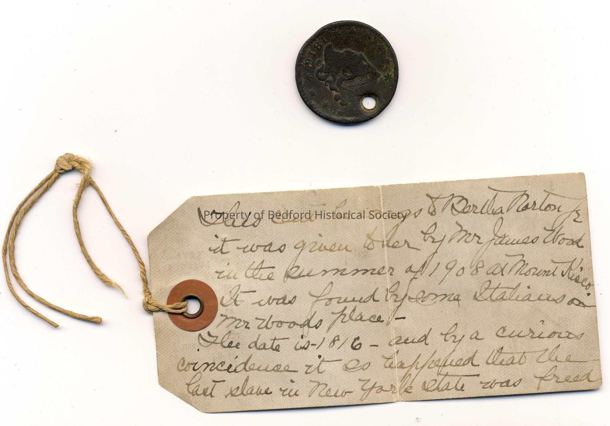 Tag associated with coin reads: "This cent belongs to Bertha Norton Jr., it was given to her by Mr. James Wood in the summer of 1908 at Mount Kisco. It was found by some Italians on Mr Woods place--The date is 1816--and by a curious coincedence it so happened that the last slave in New York State was freed in that year--at Mount Kisco--through the influence of Mr. Wood's father--from the house where Baby Bertha spent the summer of 1908 with her parents--"