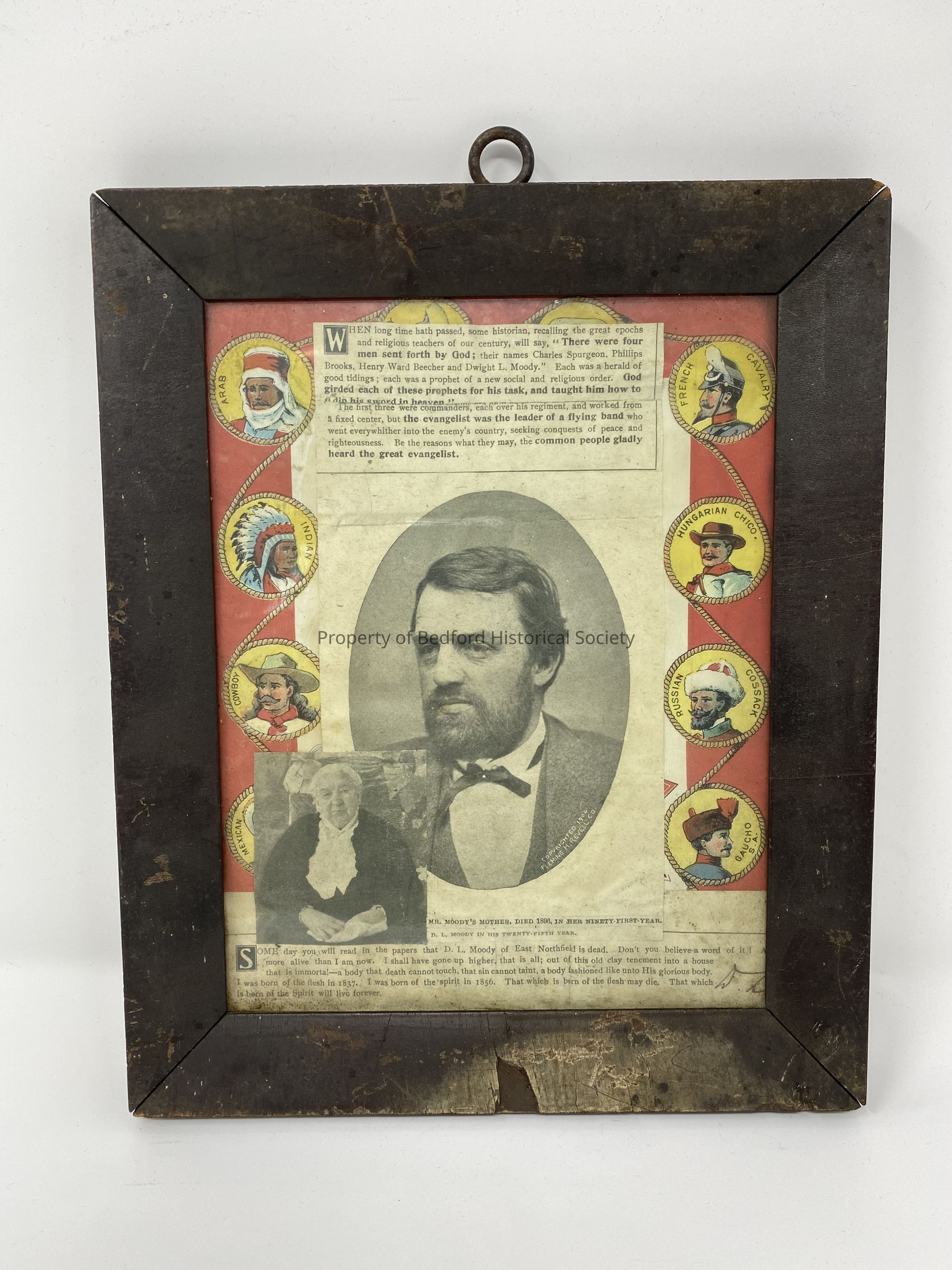 Collage framed in plain wooden frame, with cutouts of newspaper article about religious leader D.L. Moody, at top and bottome, a photo of him in the center, either side of photo has four colored drawings of different people defined by ethnicity in circular medallion design surrounded by ropes, at bottom; a photo of Moody's mother, printed next to her: Mr. Moody's mother died 1896, in her ninety first year.