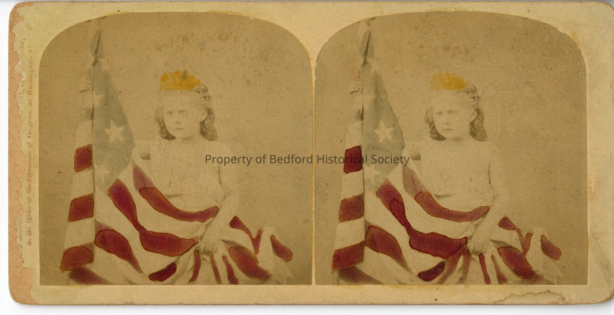 Hand colored stereographic photograph of little girl posing as Columbia, she wears a yellow crown and holds the flag to her right side