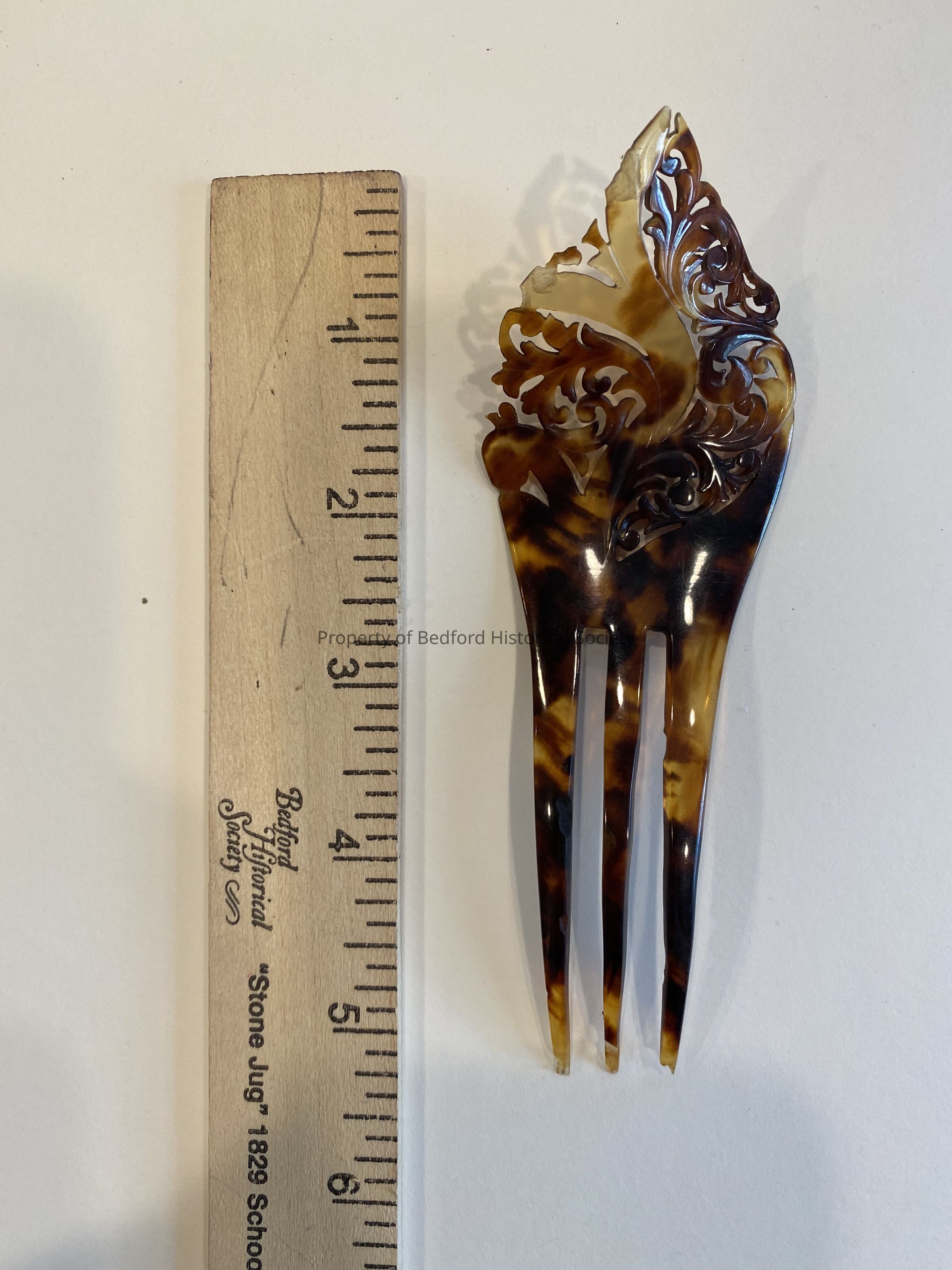small decorative tortoiseshell comb with leaf-like decoration *old location: Costume Closet, Mahogany Display Case Box #1