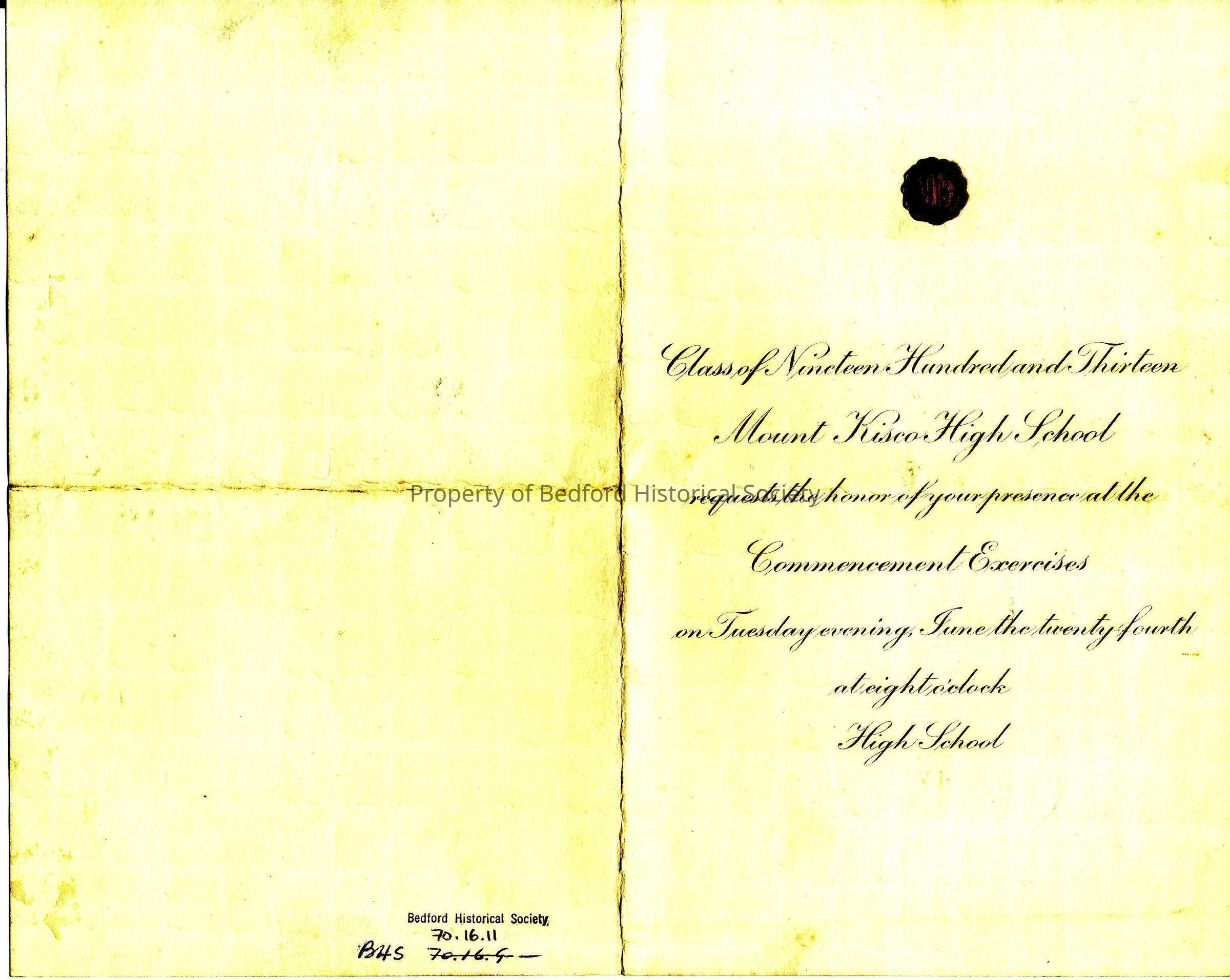 Program for the Commencement of Mount Kisco High School, 1913, with list of graduating students
