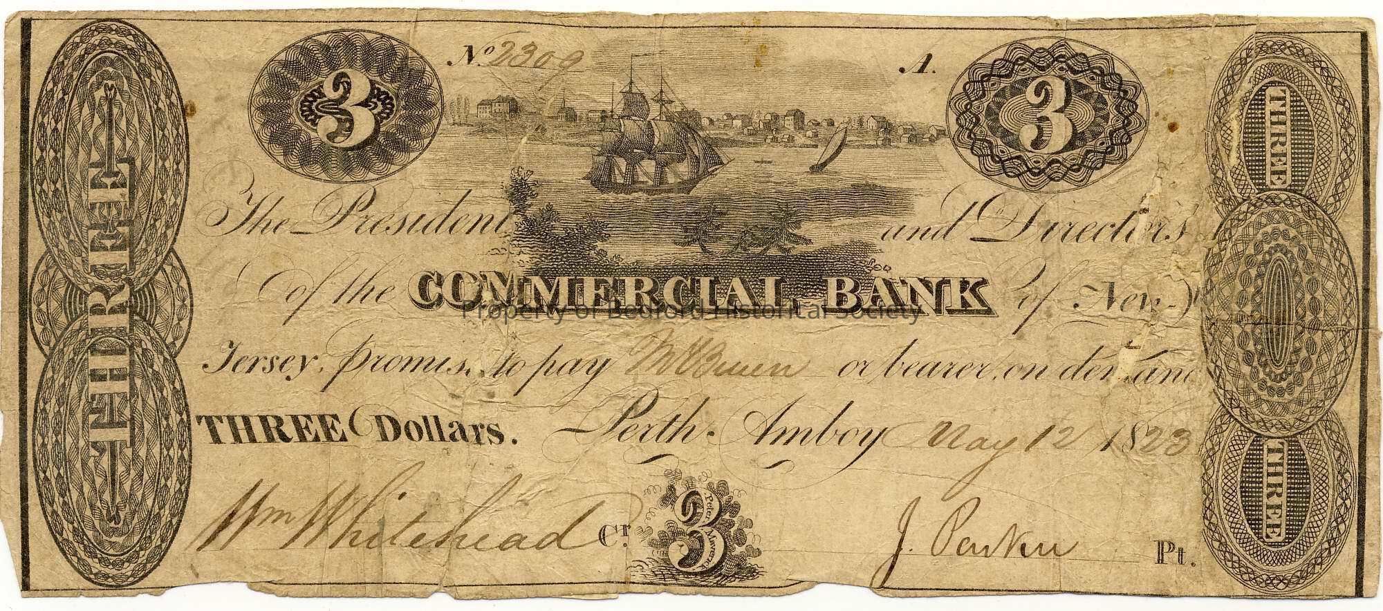 Commercial Bank of New Jersey $3 Bank Note, 1823