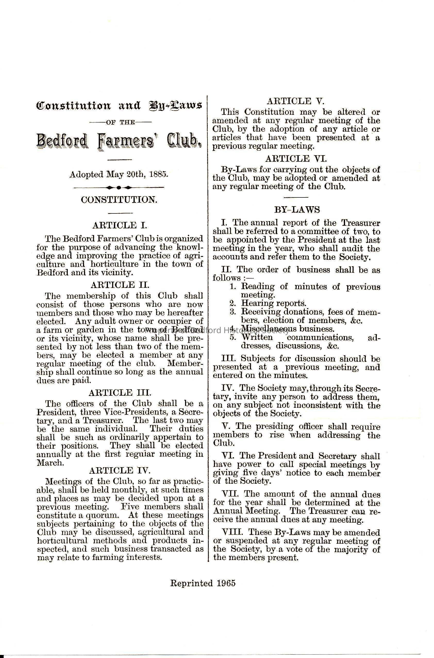 1965 reprint of the 1885 Constitution and By-Laws of the Bedford Farmers' Club (two copies)