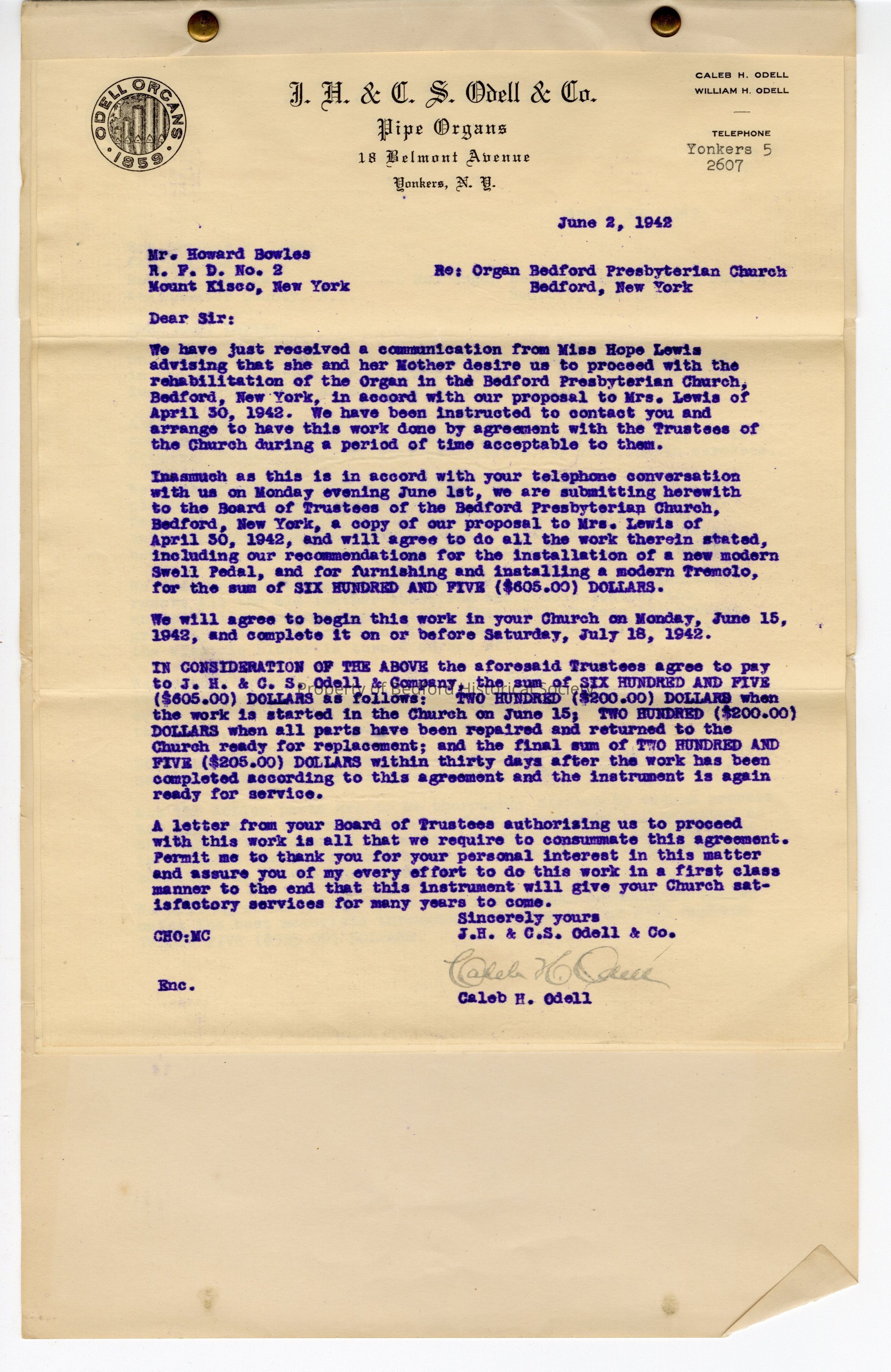 Letter from J.H. & C.S. Odell & Co High Grade Pipe Organs 18 Belmont Ave Yonkers, New York to Howard Bowles regarding Hope Lewis's request for repair of the Bedford Presbyterian Church organ