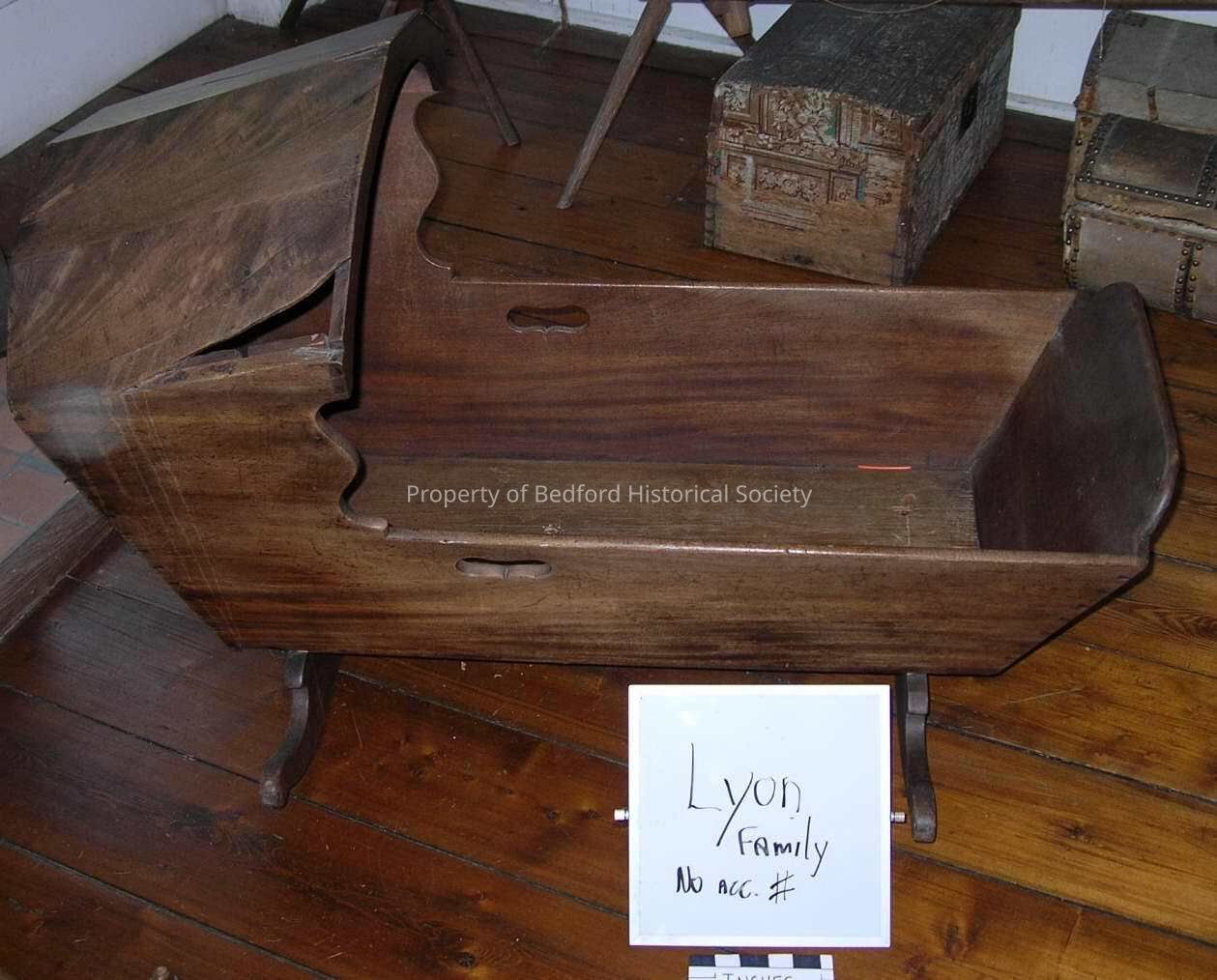 Written on bottom of cradle: "Used by family of Israel Lyon and descendants, who lived at NW corner of Route 22 and Fox Lane, Bedford, NY."
