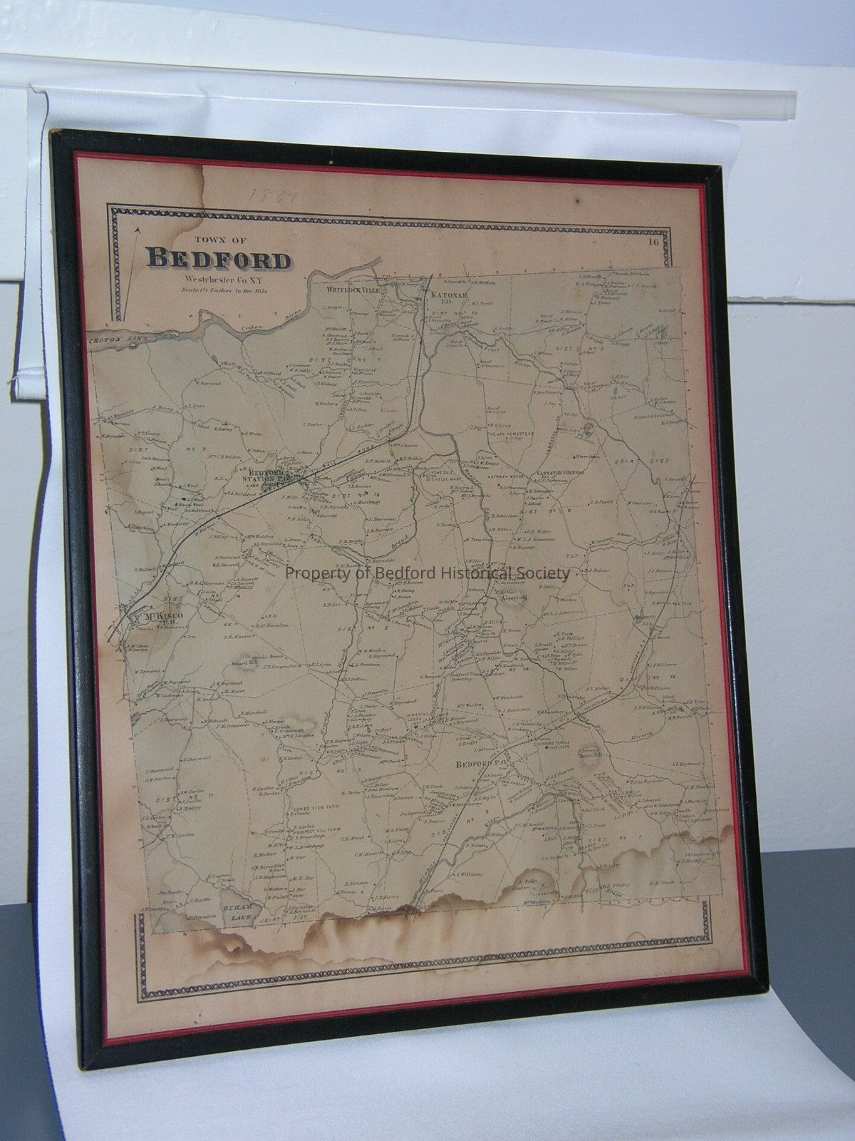 Framed map of Bedford. '1867' written on map in pencil. Note said "O'Donoghne."
