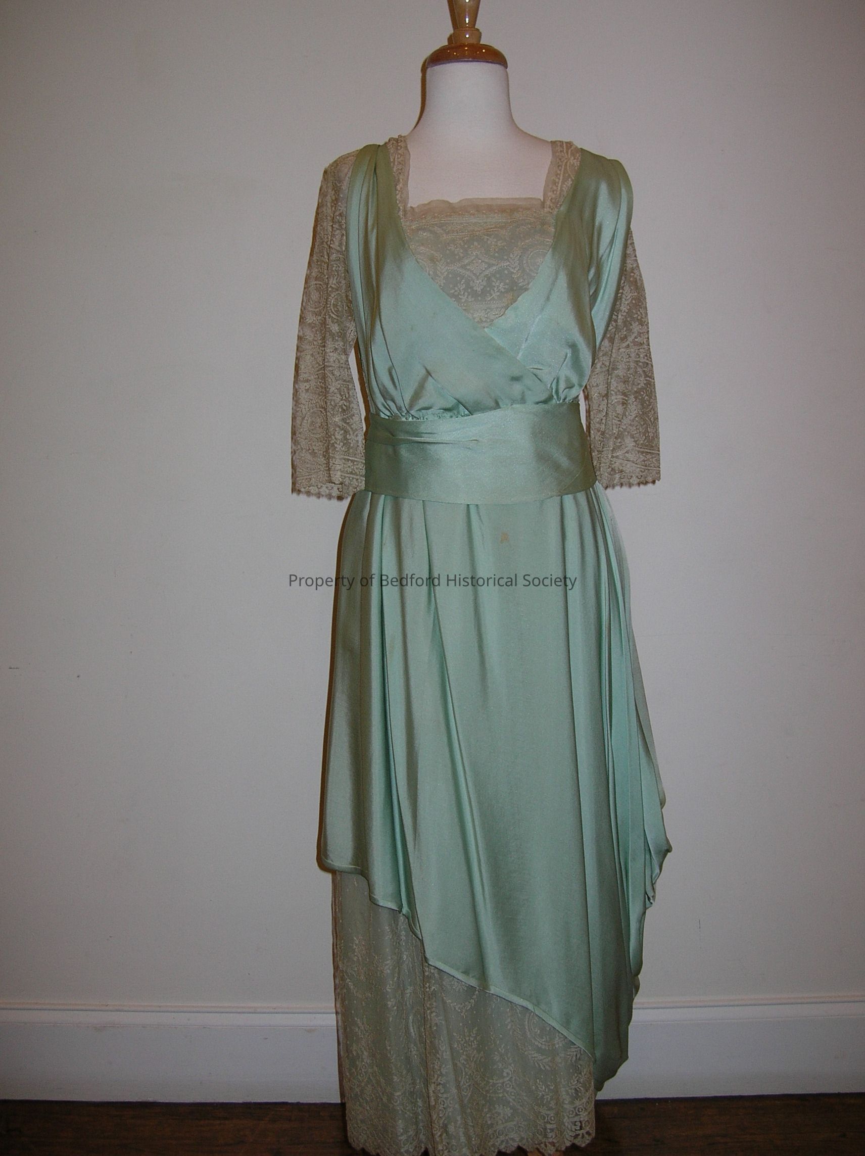Light green silk, light green chiffon, cream chiffon, cream silk, and cream lace dress. Lace three quarter sleeves. 1910s.