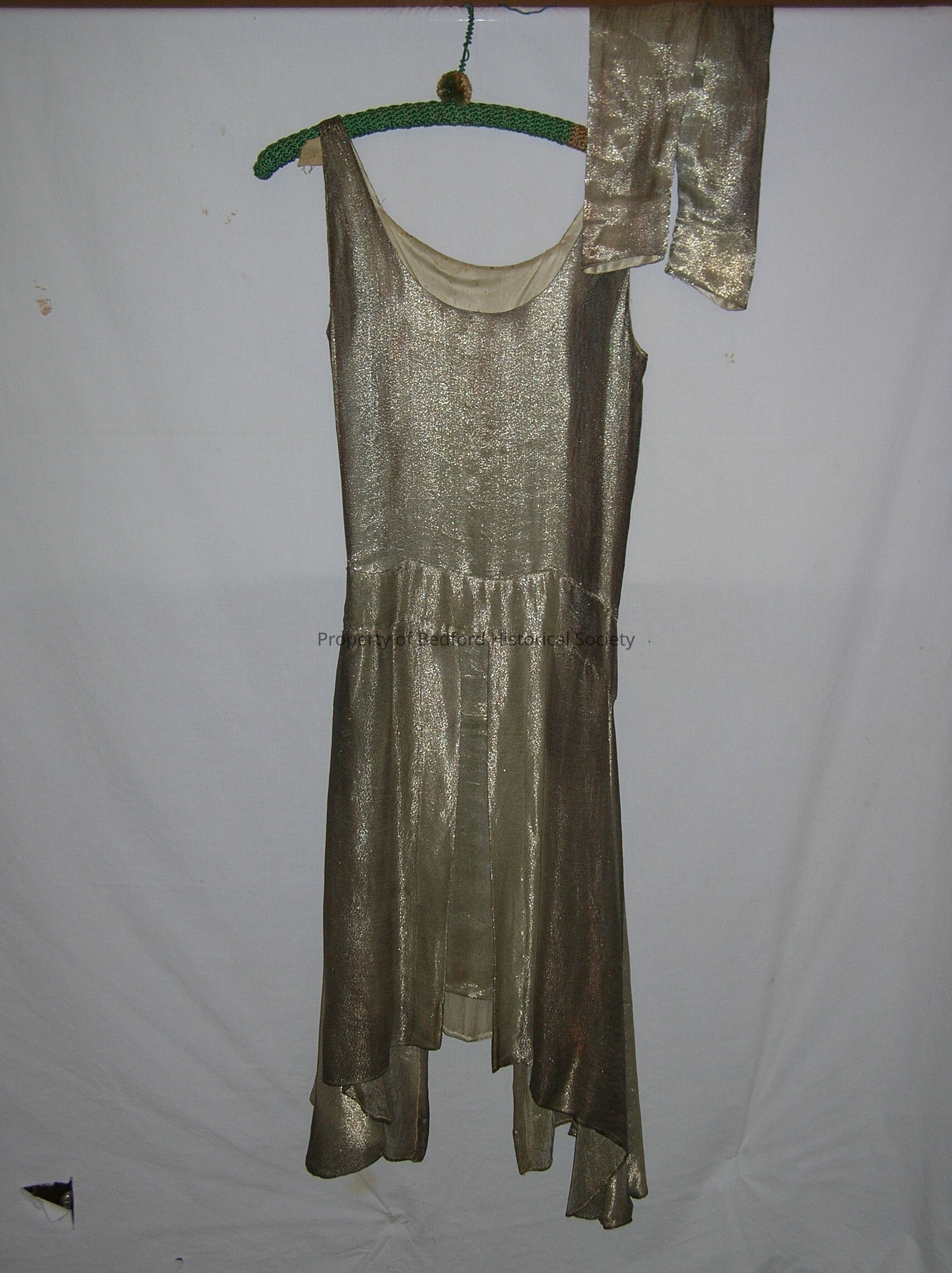 Silver lame dress with attached crystal buckle (base metal). Lined in silk chiffon. Weights in hem at center front and back. Separate dress sleeves were removed and the dress was converted into a tank style. ca. 1925.