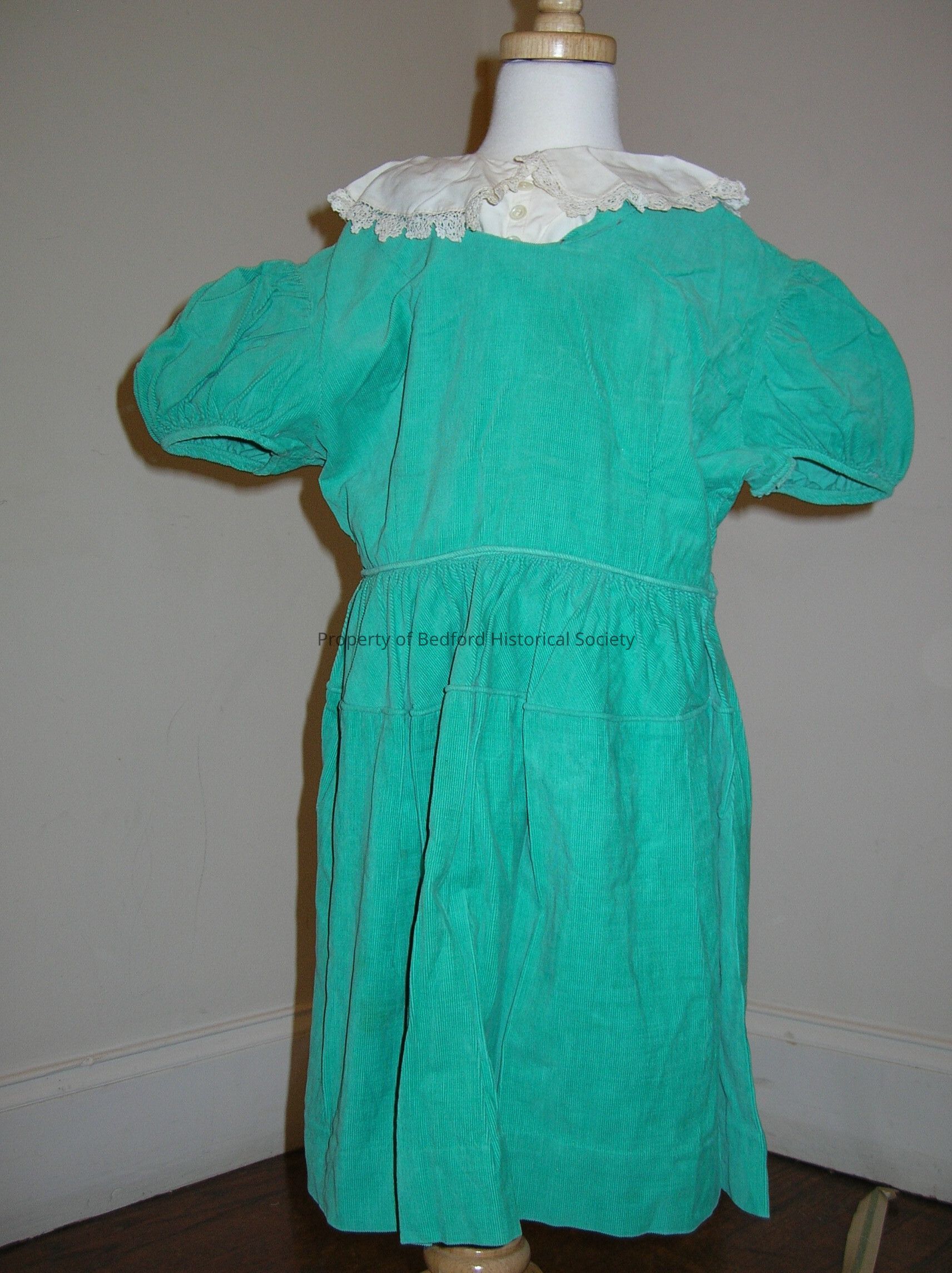 Turqoise chilren's dress having cotton and eyelet peter pan collar and puff sleeves. Belonged to Steffie or Annie.