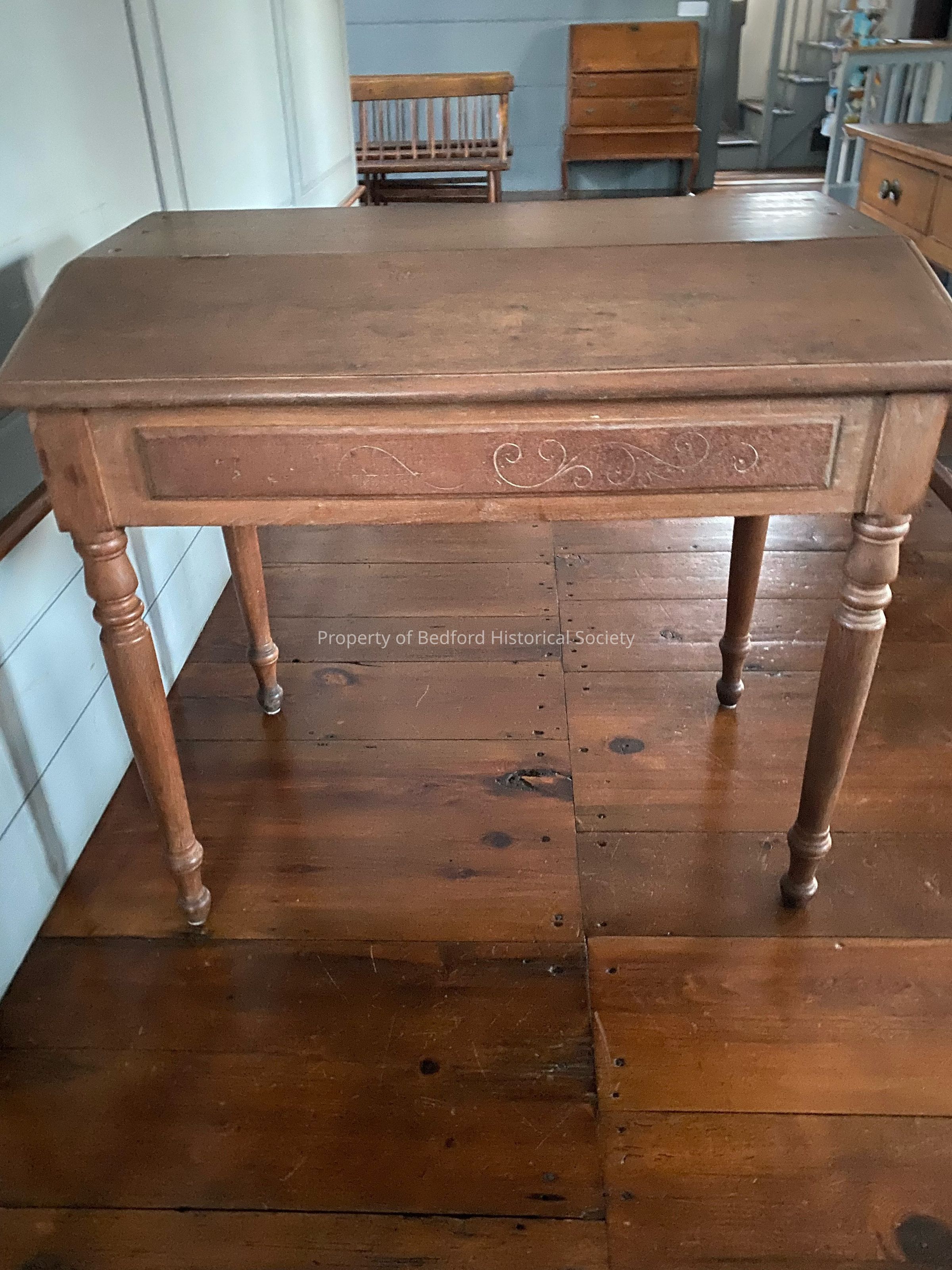 walnut and pine half slant top accounting desk, thumb molded edge, decorative incised apron panel and turned legs. Natural finish. Late 19th century.