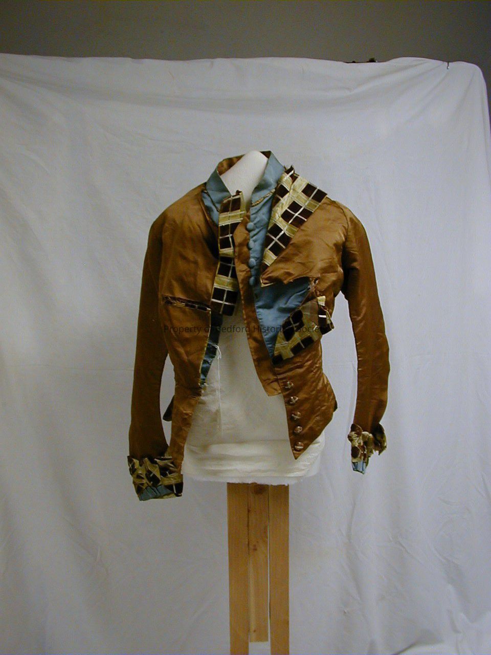 brown silk bodice with blue lining , burgendy plaid trim and scarf to match