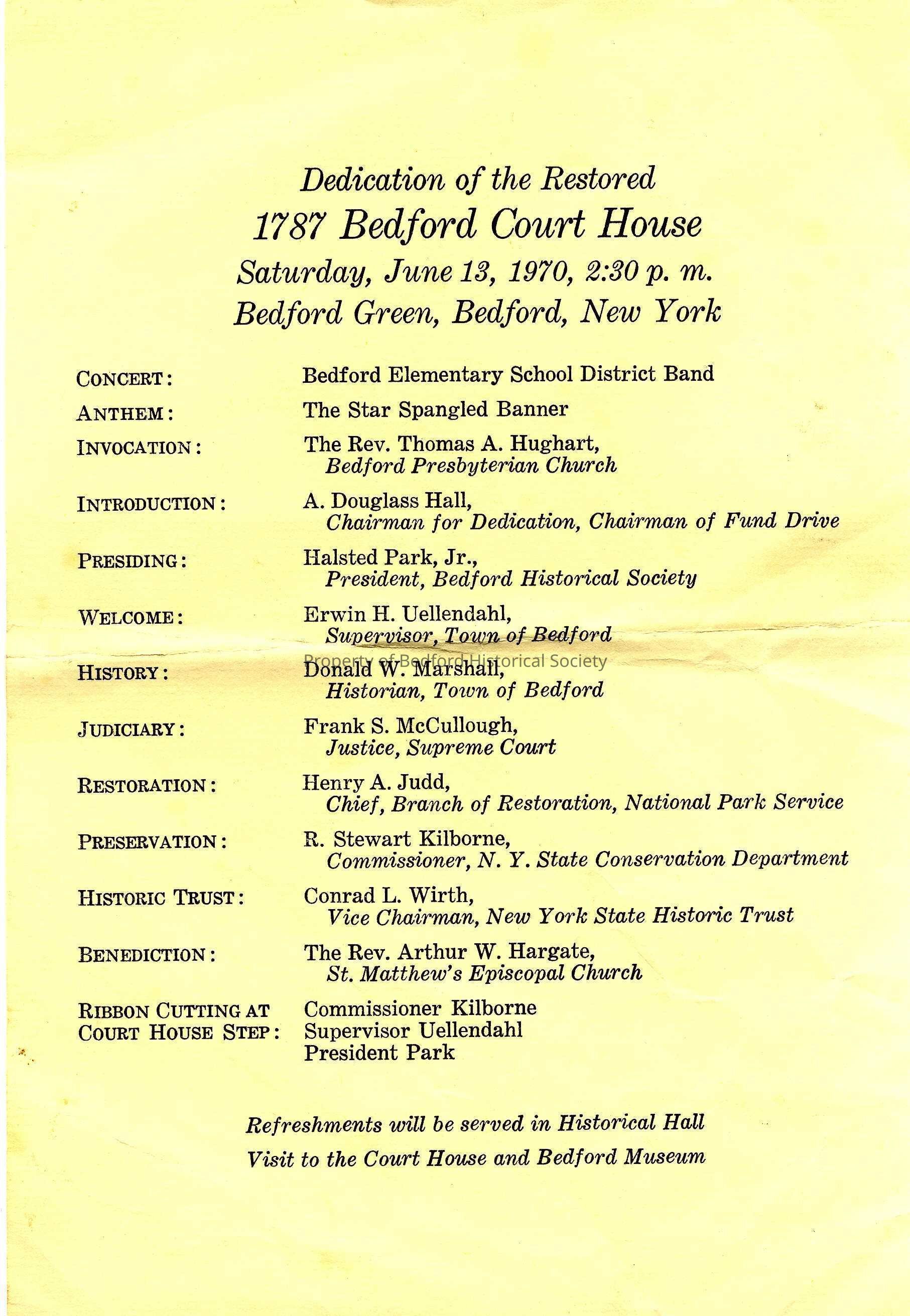 Handbill advertising the Dedication of the Restored 1787 Bedford Court House, 1970