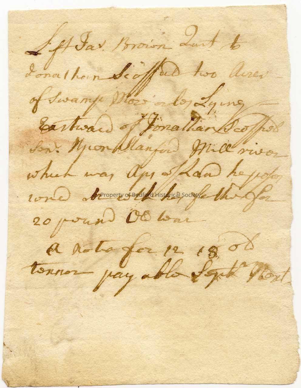 Deed of land to Jonathan Scoffield, on reverse are some calculations and the name Ebeneezer Mead