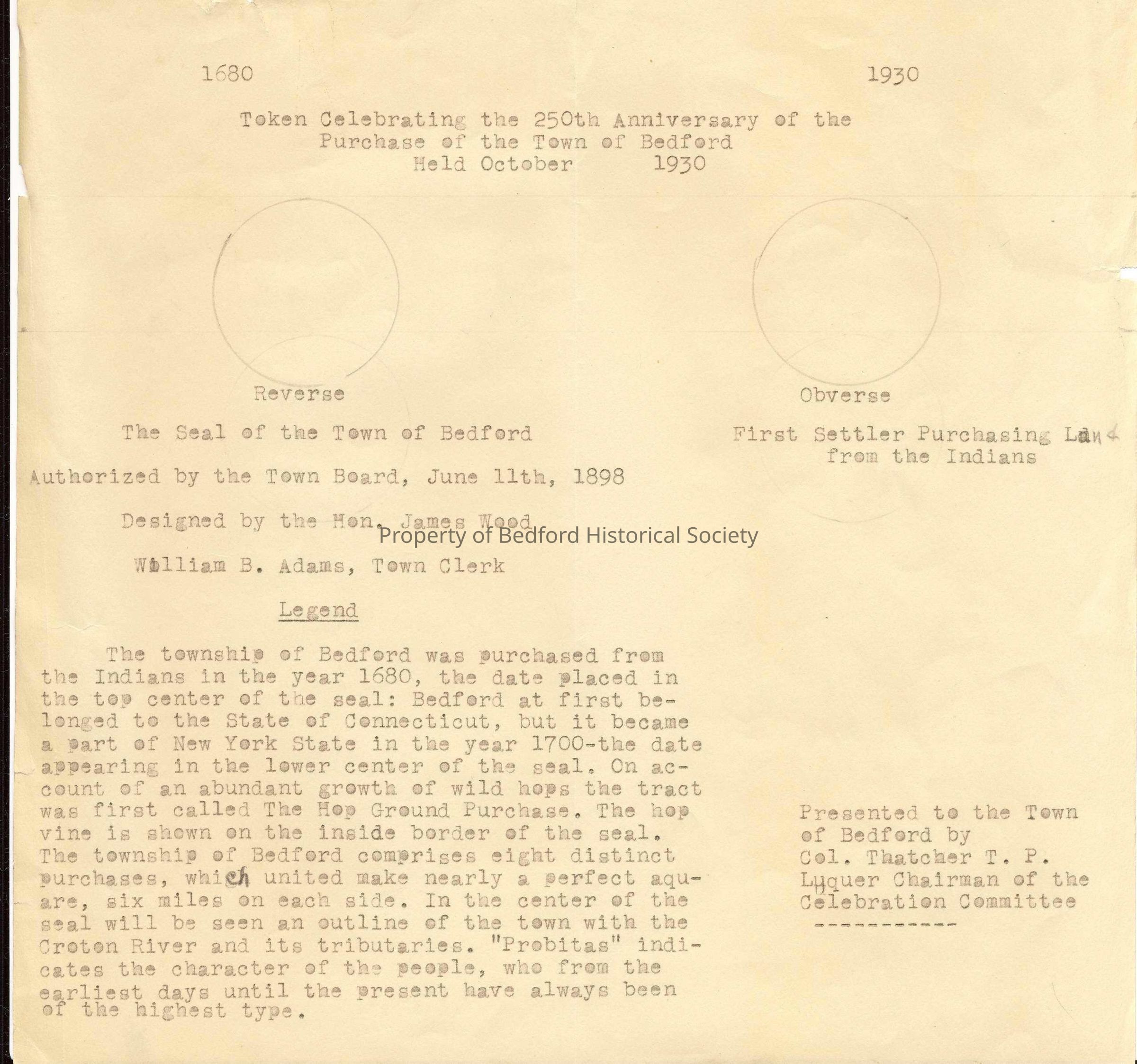 Description of token celebrating the 250th anniversary of the town of Bedford, featuring the town seal designed by James Wood