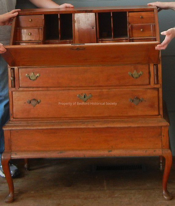 Queen Anne, slant top desk on frame. Interior drawers and cubby holes.