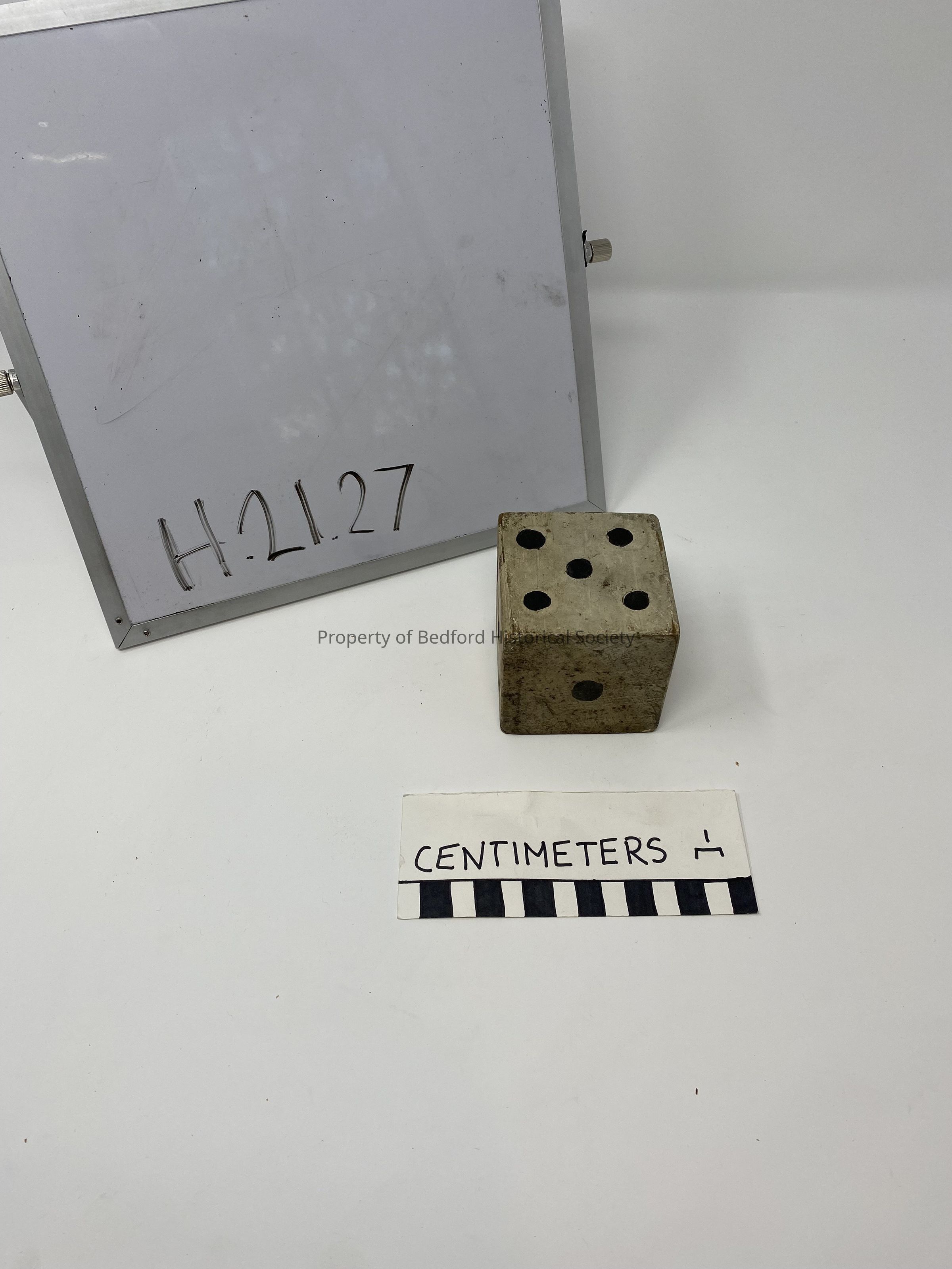 large wooden toy dice, 2 3/4" by 2 3/4" (originally found in White BHS toy cabinet)