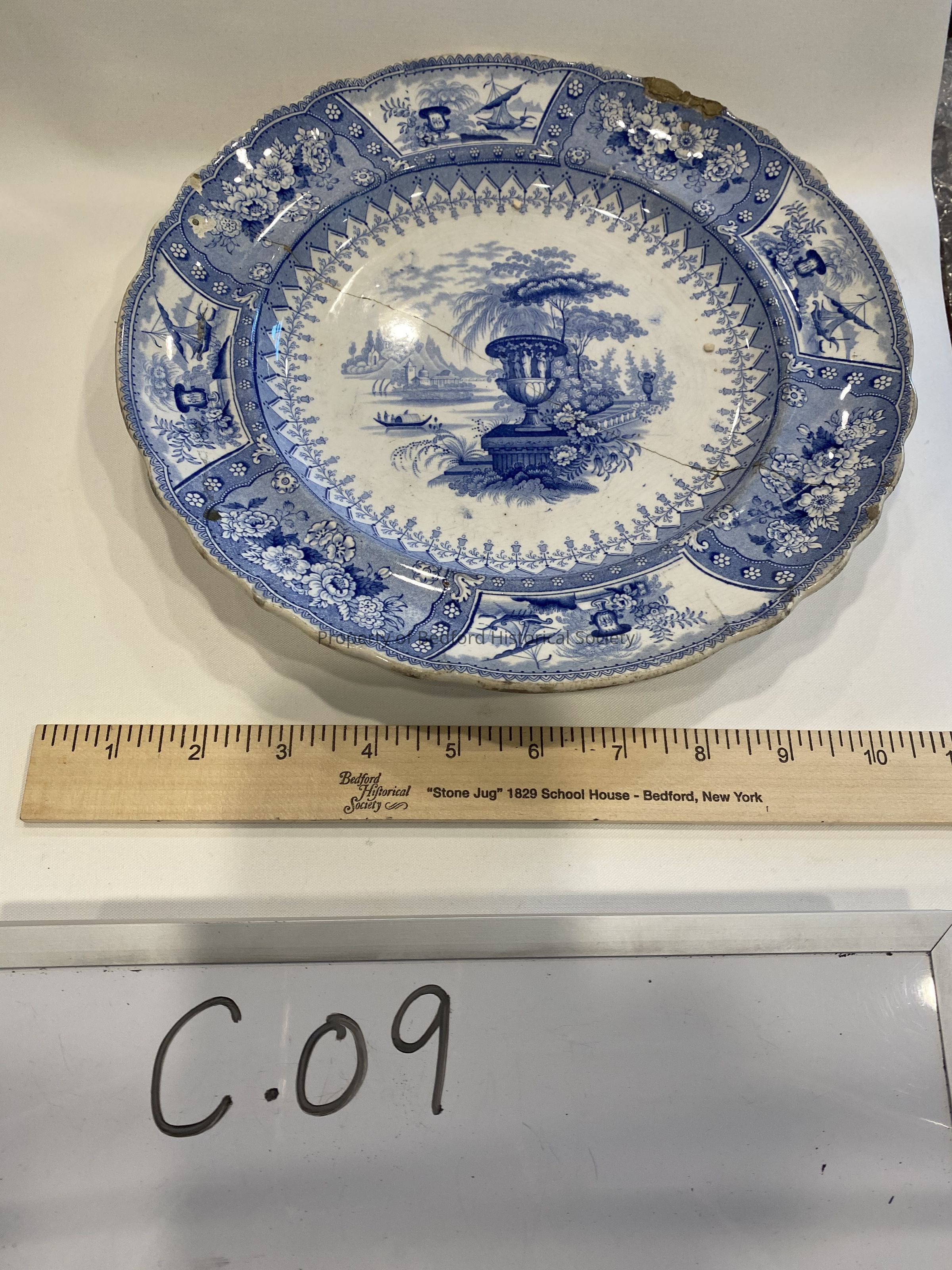 Blue and white transferware plate, given by Miss Marble. "Canova" by T, Mayer Longport, Stoke-on-Trent, England