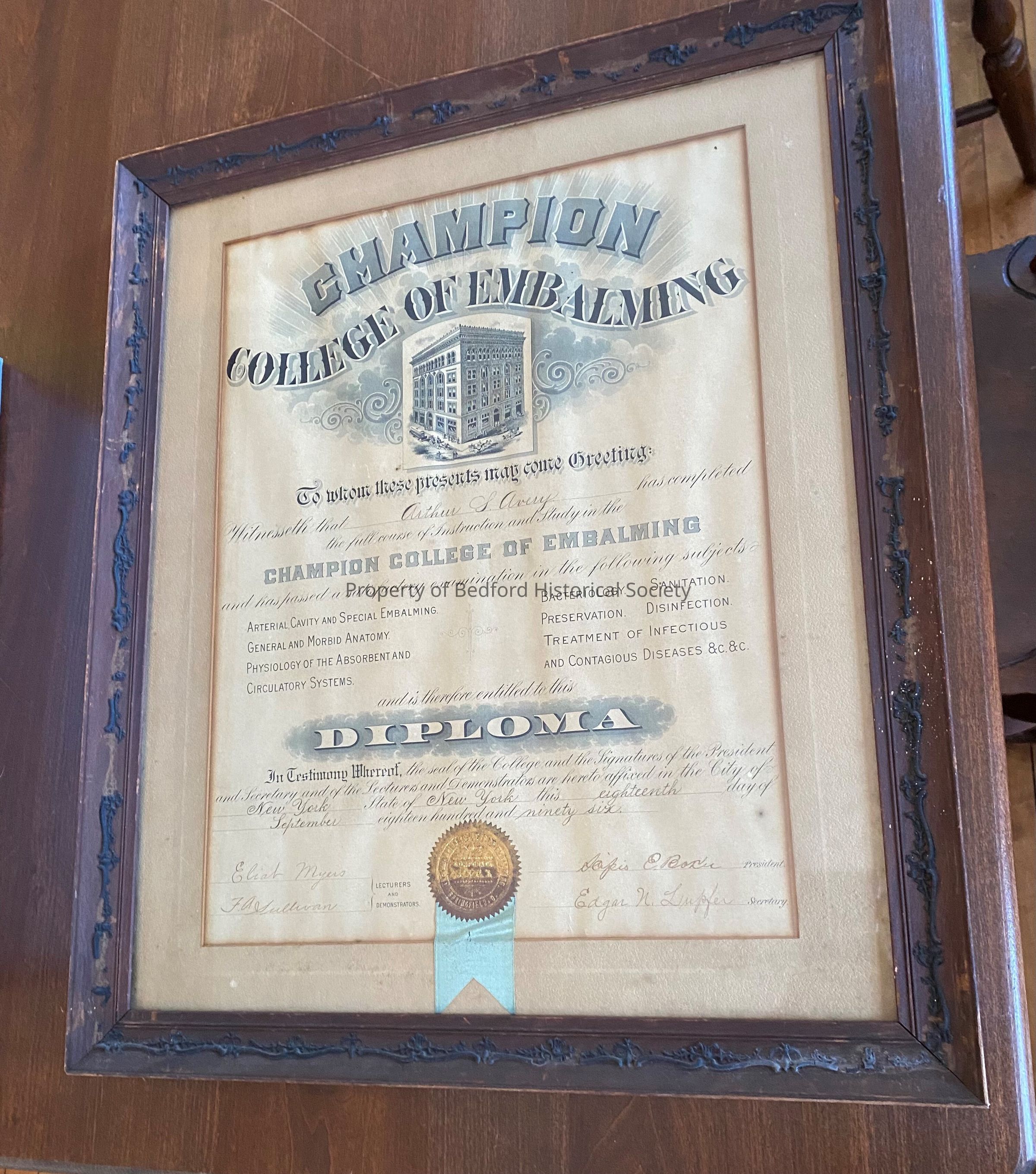 Framed diploma from Champoin College of Embalming for Arthur S. Avery