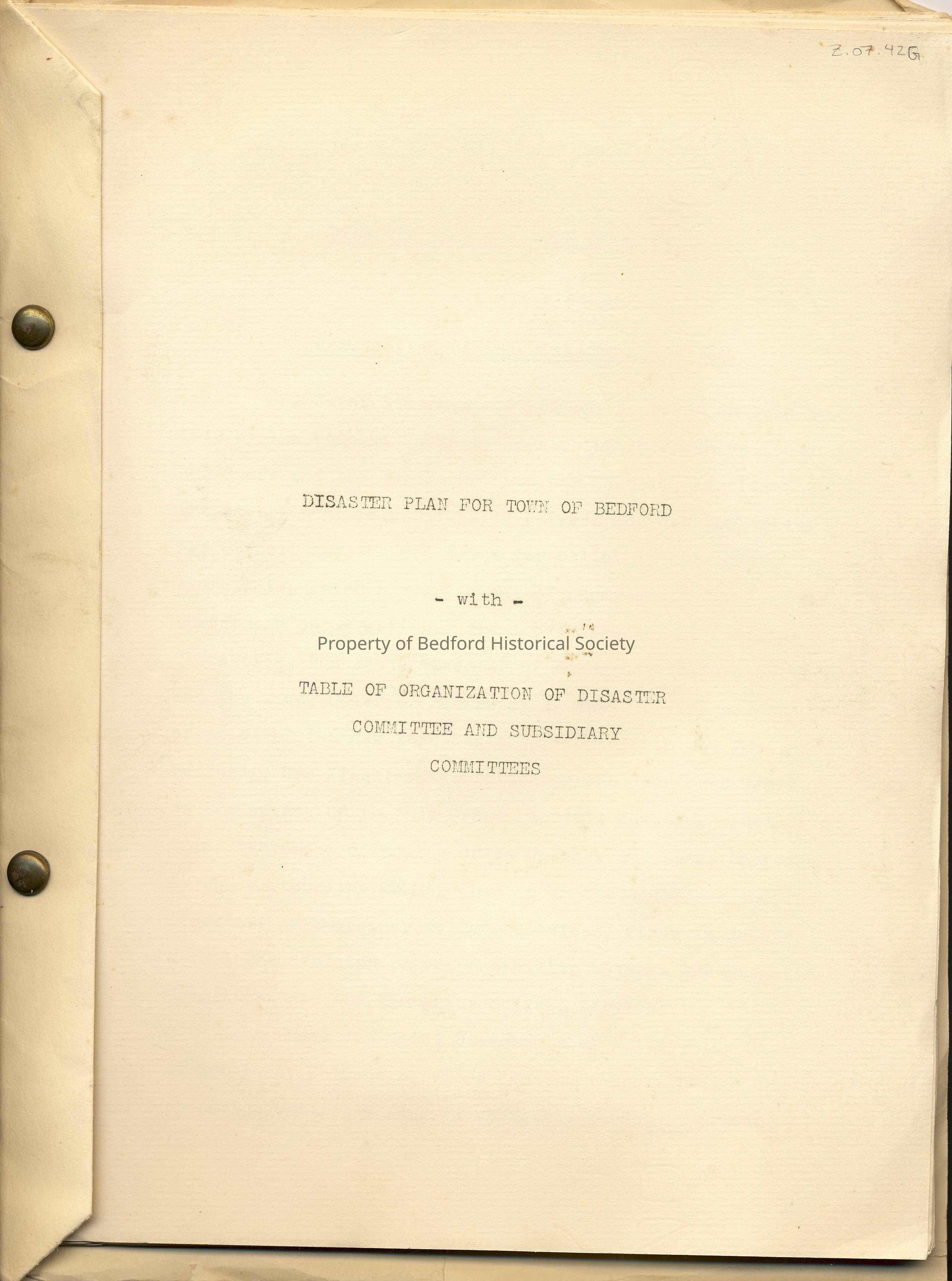 Disaster Plan for the Town of Bedford, with Table of Organization of Disaster Committee and Subsidiary Committees, 1942 *two copies