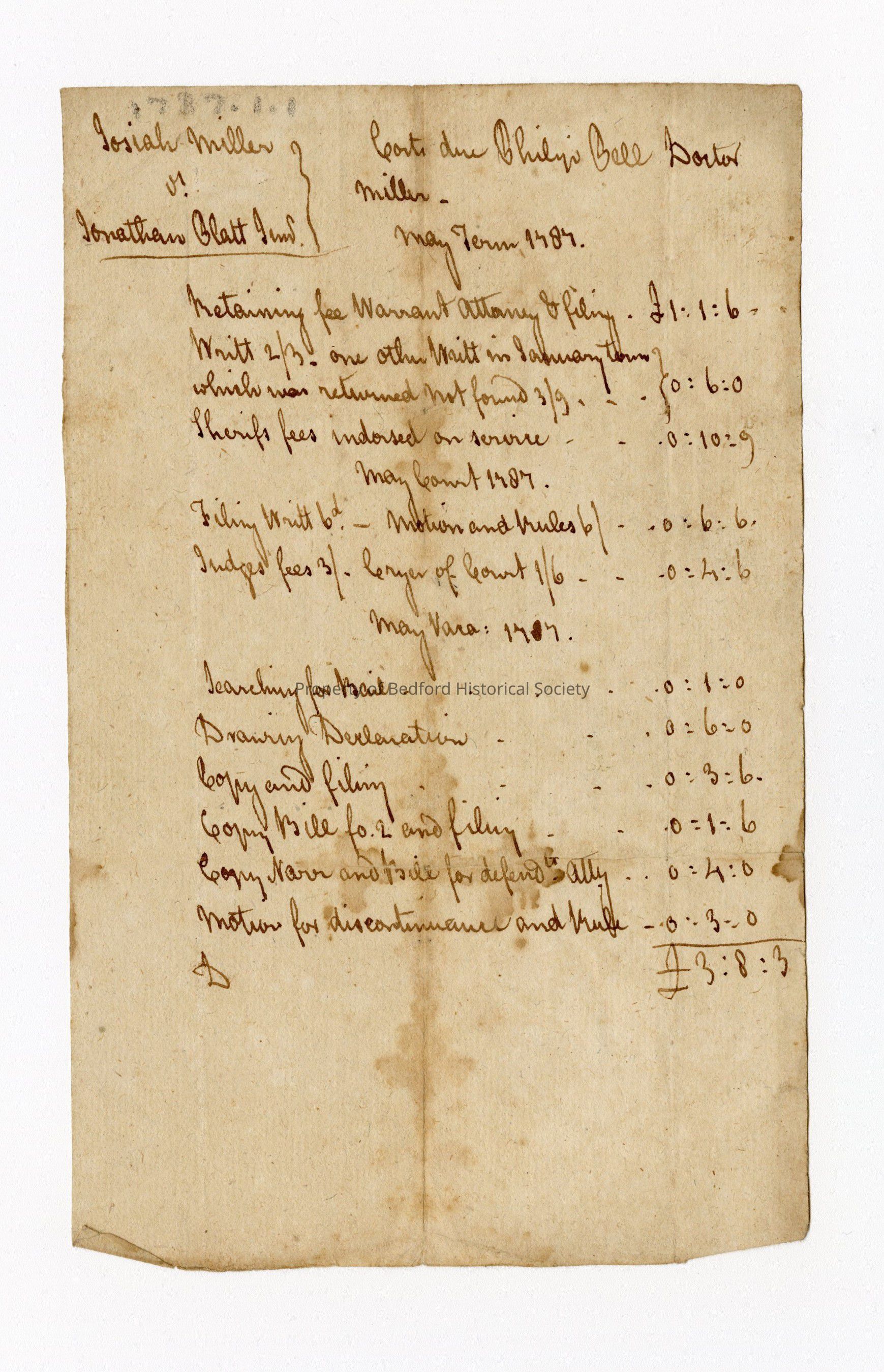 Legal costs due Phillip Bell from Jonathan Platt, Jr. May term 1787