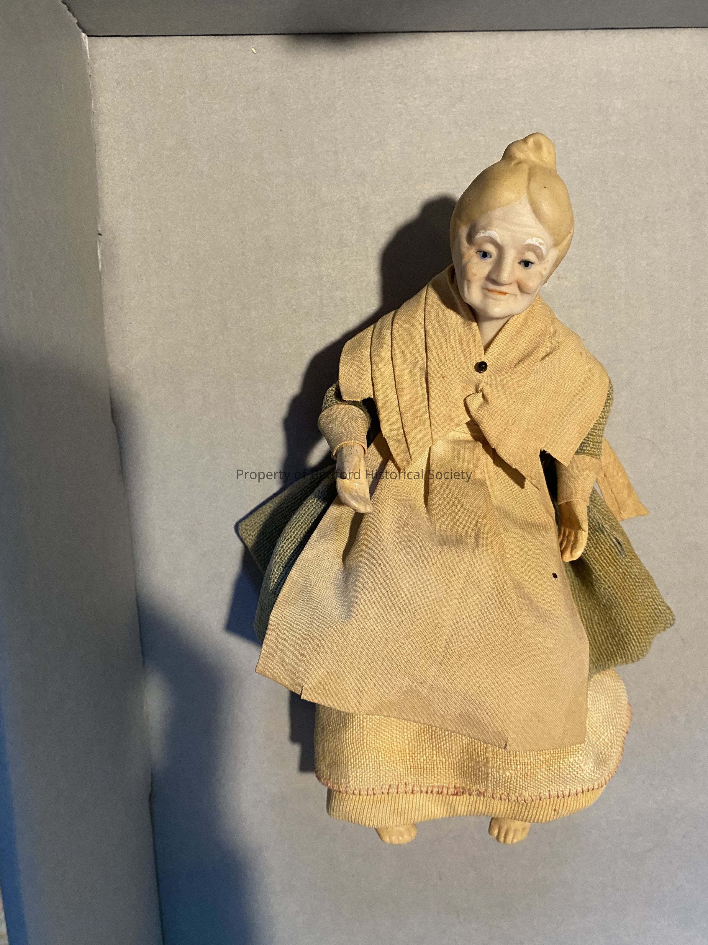 Old lady doll with green dress and beige apron, her hair molded and painted on head *needs more research
