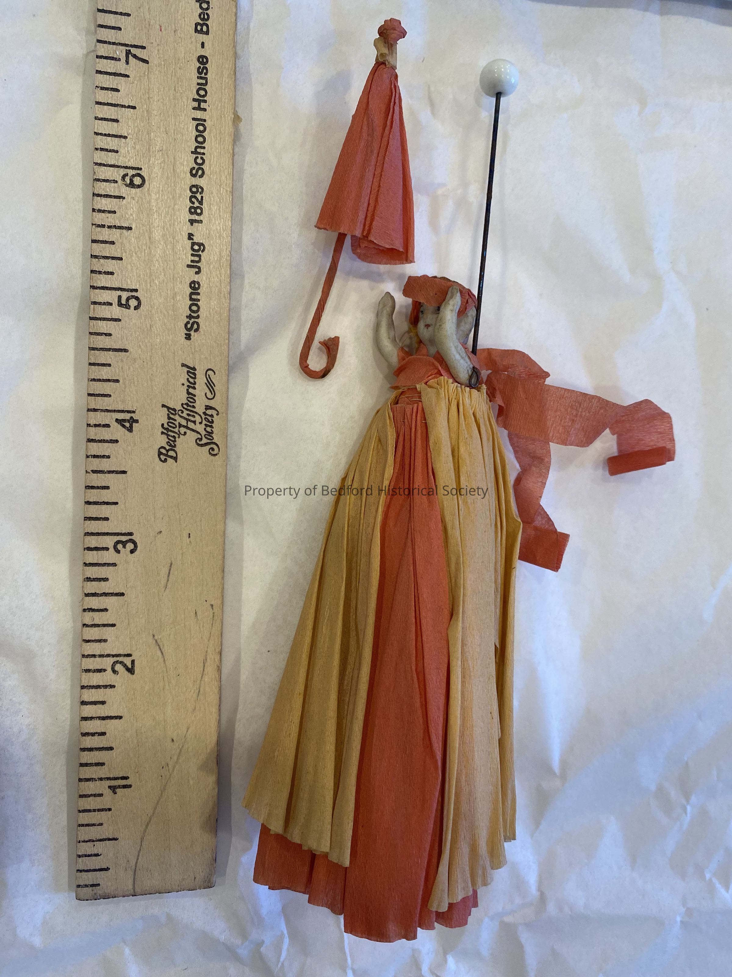 doll with salmon and pink paper dress holding an umbrella, made by Miss Eloise Luquer, 2 of 5 6"