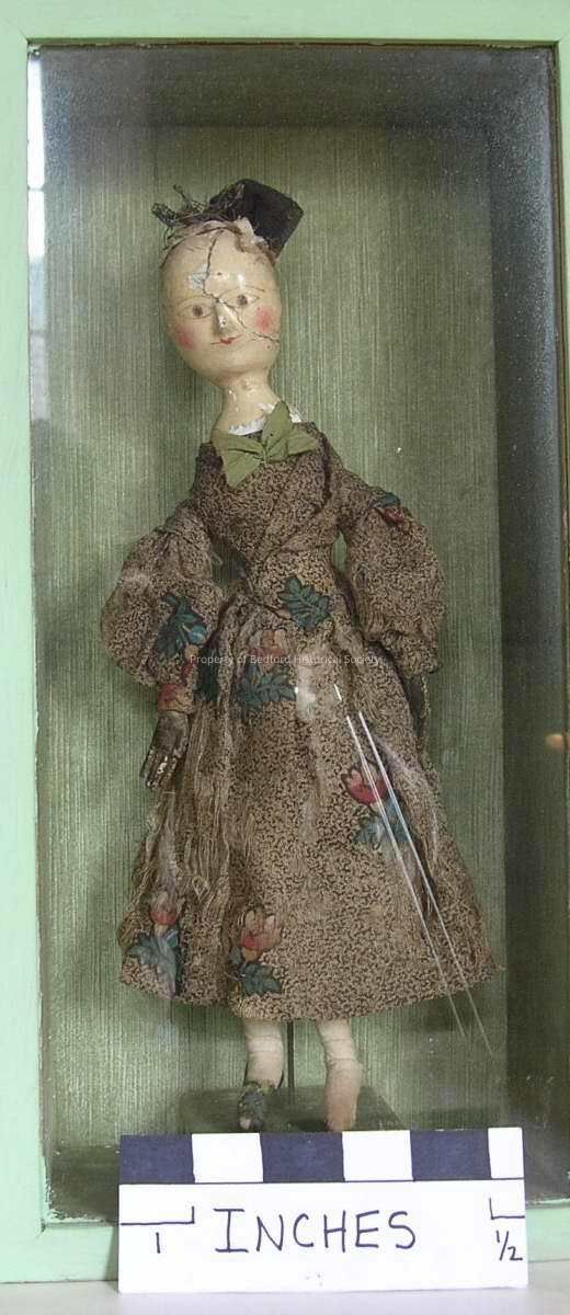 Catalogue Card: Wooden doll, "Mary Anne Georgian" circa 1830. The dress is in a costume book of that period. Had been kept in a bureau drawer. Taken to John Noble, Curator of Toys of Museum of City of New York for advice as to restoration who was enthusiastic--in spite of doll's bad condition (no hair, cracks, dress split, etc.) He steamed dress and had doll mounted in the shadow box. Also, painted the watercolor picture of the doll as she was in her youth.