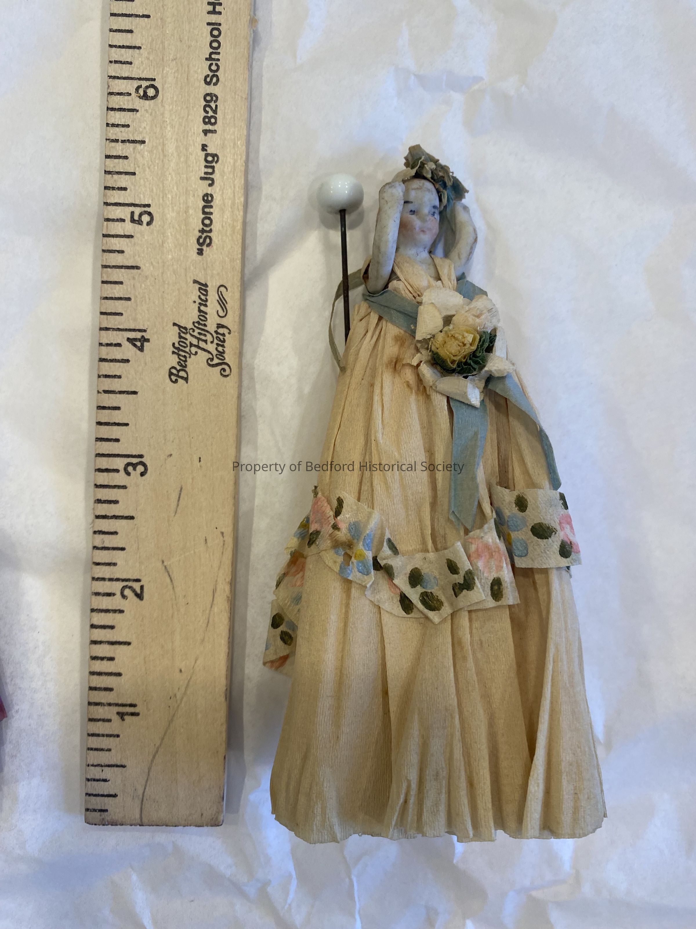 doll with ivory paper dress and blue ribbons, made by Miss Eloise Luquer, 3 of 5 6"